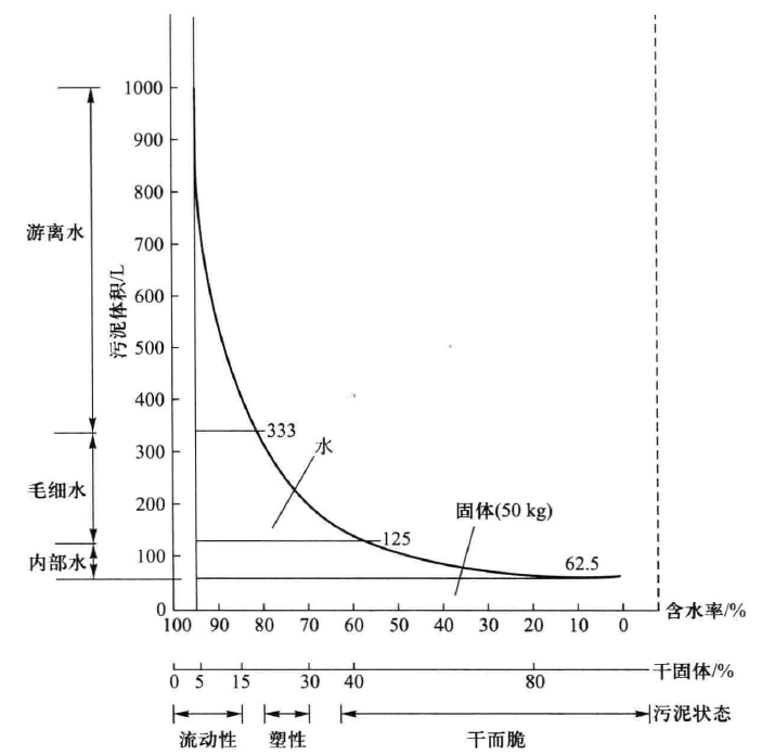 從污泥含水率與污泥狀態(tài)的關系圖可以看出,為了便于污泥處置時的運輸,污泥要脫水,使含水率降至80% 以下,失去流態(tài)。通常,若污泥進行填埋,其含水率要在60% 以下。