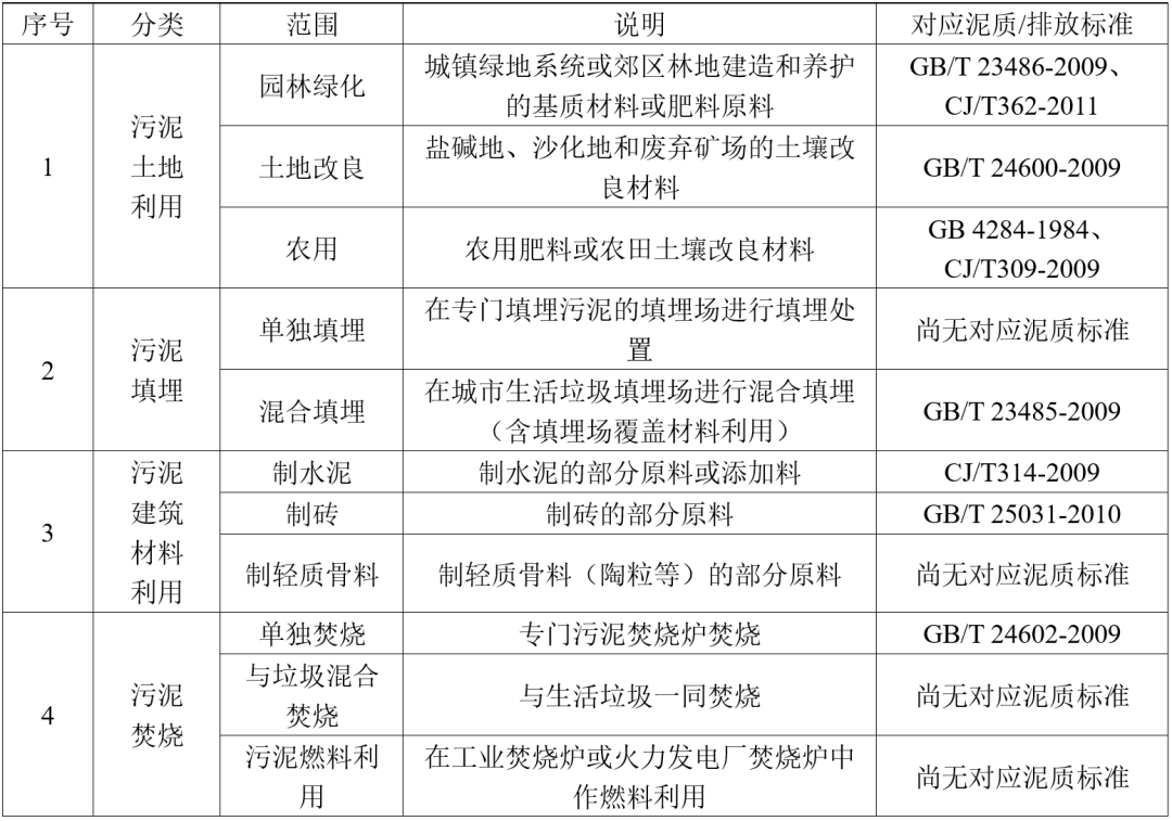 2009-2011年在住建部主導下,編制出臺了一批城鎮(zhèn)污水處理廠污泥處理處置標準,其中《GB/T23484-2009城鎮(zhèn)污水處理廠污泥處置 分類》中明確給出四類共11條處置路線,與這些處置路線對應出臺(延用)了一系列泥質標準。