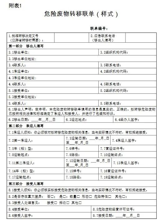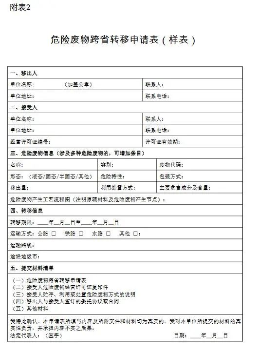 (一)危險廢物跨省轉(zhuǎn)移申請表,格式見附表2。