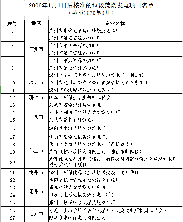 2.2006年1月1日后核準的垃圾焚燒發(fā)電項目名單 (截至2020年9月)