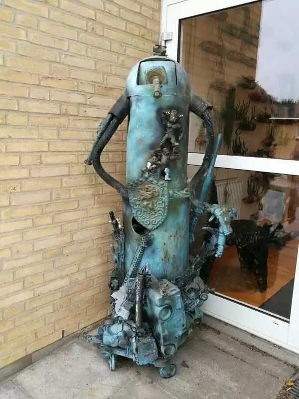 辦公室門口拜訪著一個利用廢棄物制作的小機器人模型