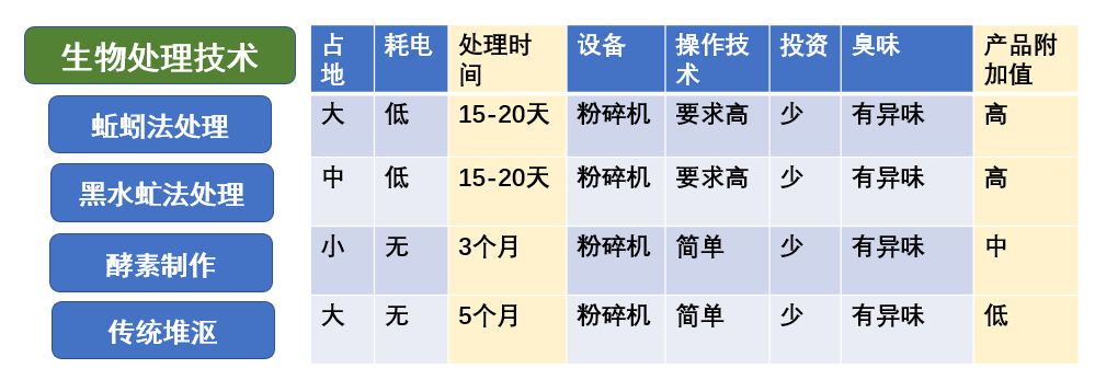 各種生物法處理技術(shù)有其不同的特點(diǎn),通過(guò)比較處理廢棄物占地多少、處理噸成本耗電、發(fā)酵時(shí)間長(zhǎng)短、處理操作難易與投資高低、人工投入多少、處理過(guò)程對(duì)環(huán)境產(chǎn)生的臭味異味多少、產(chǎn)品附加值高低,來(lái)了解不同處理技術(shù)的優(yōu)點(diǎn)和不足。