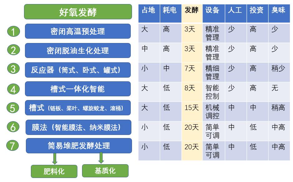 各種好氧發(fā)酵處理技術(shù)有其不同的特點(diǎn),通過(guò)比較處理廢棄物占地多少、處理噸成本耗電、發(fā)酵時(shí)間長(zhǎng)短、設(shè)備操作難易與投資高低、人工投入多少、處理過(guò)程對(duì)環(huán)境產(chǎn)生的臭味異味多少,來(lái)了解不同處理技術(shù)的優(yōu)點(diǎn)和不足。