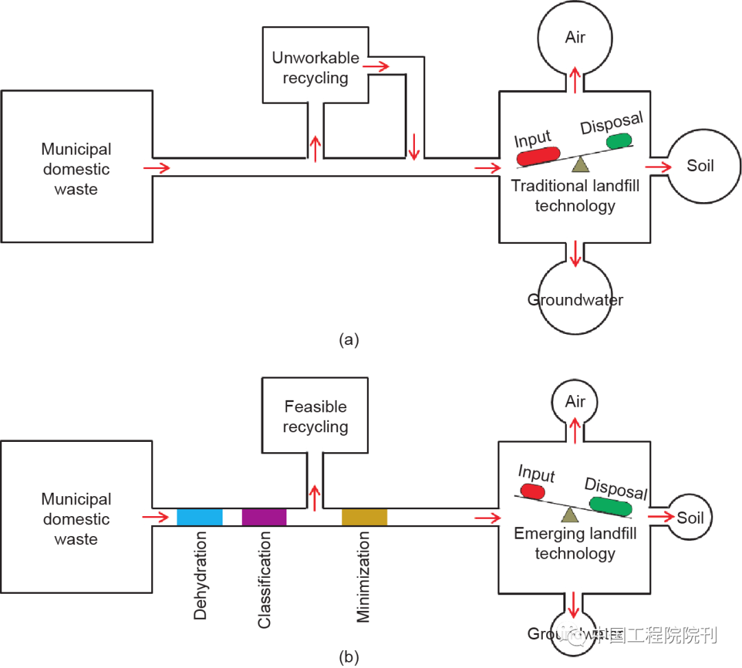 如何解決生活垃圾資源化循環(huán)不平衡、污染防治失控等關(guān)鍵問題,已成為社會(huì)、經(jīng)濟(jì)、環(huán)境保護(hù)和科技關(guān)注的焦點(diǎn)。近年來,我國政府高度重視改善環(huán)境問題,并加大了對生活垃圾處理的投資,這對于我國進(jìn)一步推行綠色發(fā)展模式具有重要意義。在本文中,筆者強(qiáng)調(diào)城市生活垃圾全過程處理的重要性[圖1(b)],并分別對生活垃圾處理前端的分類、減量化與資源化技術(shù),以及末端的污染物快速消化、防泄漏與修復(fù)技術(shù)提出新思路和新建議。