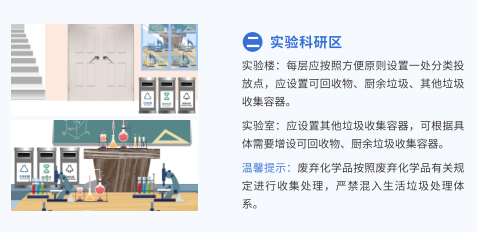 學校場景的指引按師生的日?;顒?,分區(qū)進行指導,貼合師生生活實際。其中對實驗科研區(qū)可能會產生廢棄化學品,指引中做出了相關溫馨提示,“廢棄化學品按照廢棄化學品有關規(guī)定進行收集處理,嚴禁混入生活垃圾處理體系”。