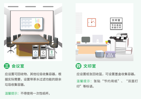 機關企事業(yè)單位、工業(yè)園區(qū)、商務寫字樓要發(fā)揮生活垃圾源頭減量示范作用,三份指引里明確提倡綠色辦公,優(yōu)先采購可循環(huán)利用的產品,減少使用一次性辦公用品,推廣無紙化辦公,紙張盡量雙面書寫或雙面打印。另外會議室貼合實際設置帶茶水過濾功能的廚余垃圾收集容器,著重提示不得使用一次性紙杯。