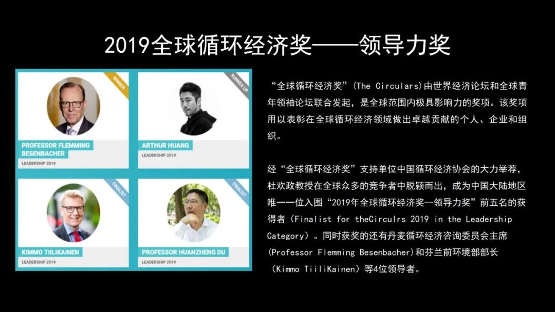 從我們國(guó)家來(lái)講,全國(guó)200多個(gè)大中城市,每年會(huì)產(chǎn)生2億多噸的垃圾,這個(gè)量非常大,如果中國(guó)的垃圾分類工作做好了,全世界的循環(huán)經(jīng)濟(jì)的工作就做好了三分之一,所以達(dá)沃斯世界經(jīng)濟(jì)論壇設(shè)立了一個(gè)全球循環(huán)經(jīng)濟(jì)獎(jiǎng),專門獎(jiǎng)勵(lì)這方面的企業(yè)和領(lǐng)導(dǎo)人、專家,很榮幸在2019年,我作為中國(guó)大陸唯一的一個(gè)人入圍了它的領(lǐng)導(dǎo)力獎(jiǎng)。