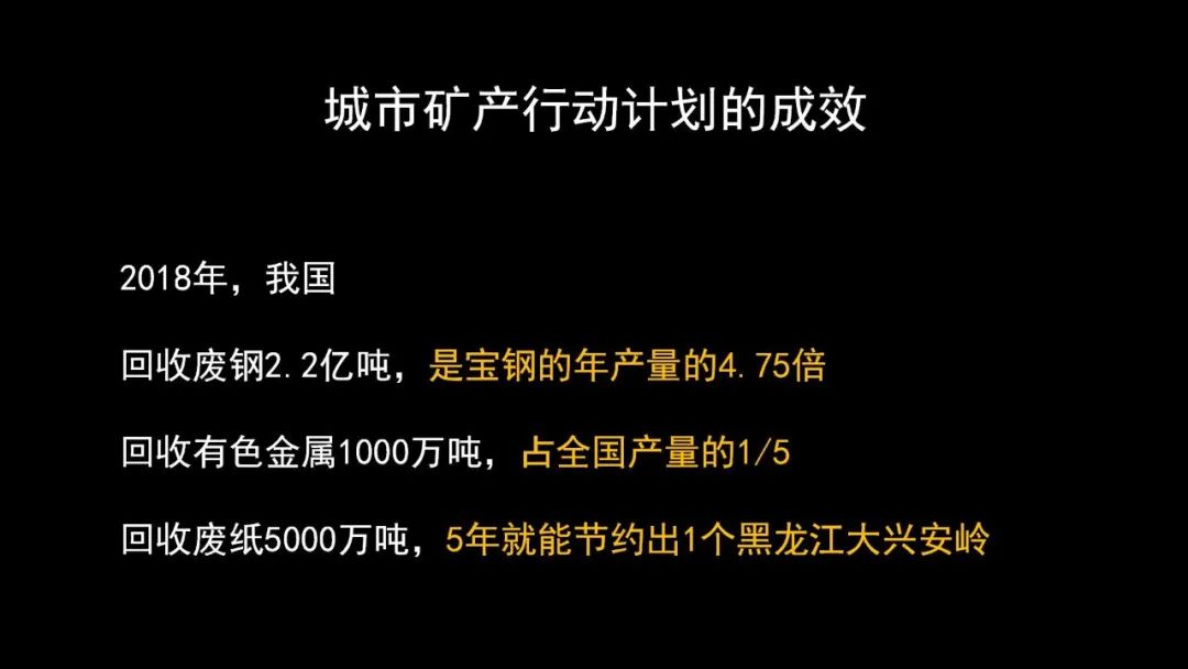從2009年我們實(shí)施城市礦產(chǎn)行動(dòng)計(jì)劃,到2018年,有什么樣的效果呢,大家看這幾組數(shù)據(jù)就知道了。2018年,我們回收的廢鋼鐵是2.2億噸,大概相當(dāng)于中國(guó)寶鋼2018年產(chǎn)量的4.75倍;我們回收的再生有色金屬是1000萬(wàn)噸,當(dāng)年我們有色金屬產(chǎn)量是什么呢?5000萬(wàn)噸,占了全年的五分之一;2018年回收的廢紙是5000萬(wàn)噸,這5000萬(wàn)噸廢紙如果連續(xù)5年回收使用,相當(dāng)于我們一個(gè)大興安嶺的森林來(lái)解決我們用紙的問題。