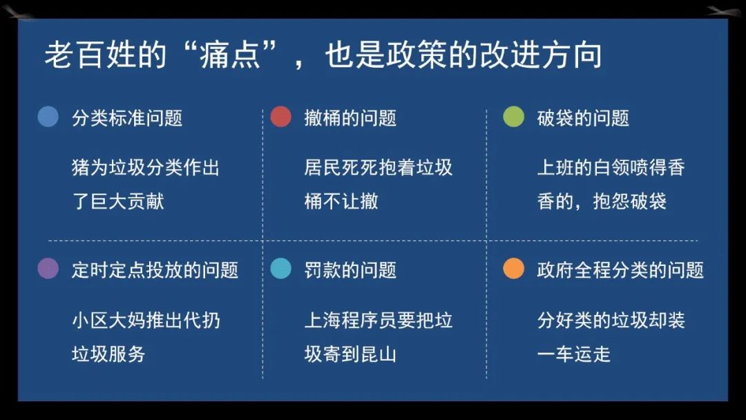 當(dāng)然除了分類的標(biāo)準(zhǔn)以外,還有撤桶的問題、破袋的問題、還有定時(shí)定點(diǎn)投放的問題、還有罰款的問題、還有政府是不是全程分類的問題,這些都是每個(gè)老百姓關(guān)注的。