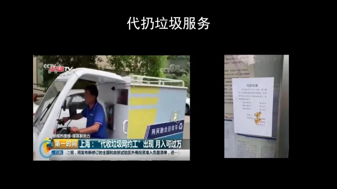 上海有大量的年輕人上班 996,定時(shí)定點(diǎn)投放垃圾,到這個(gè)時(shí)間我在上班我沒辦法投,怎么辦?這也是大家提出來(lái)的問題,所以有些年輕人就想了辦法,干脆我的垃圾請(qǐng)人代扔,我給你錢,這叫代扔垃圾;