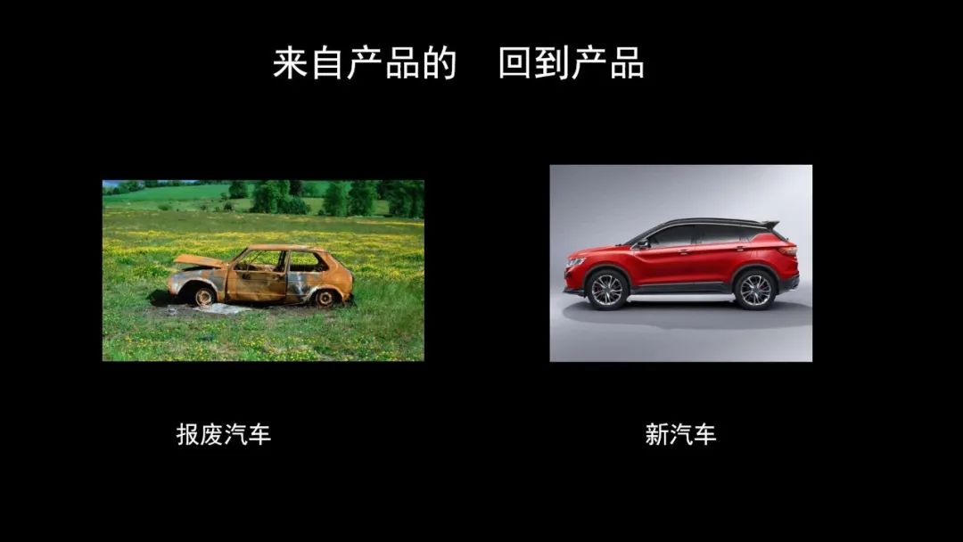 我們家報(bào)廢的舊汽車,把里面的金屬,把里面的銅鋁 鐵、塑料回收,可能變成你家接下來(lái)要的新汽車,我想這就是來(lái)自產(chǎn)品,回到產(chǎn)品。