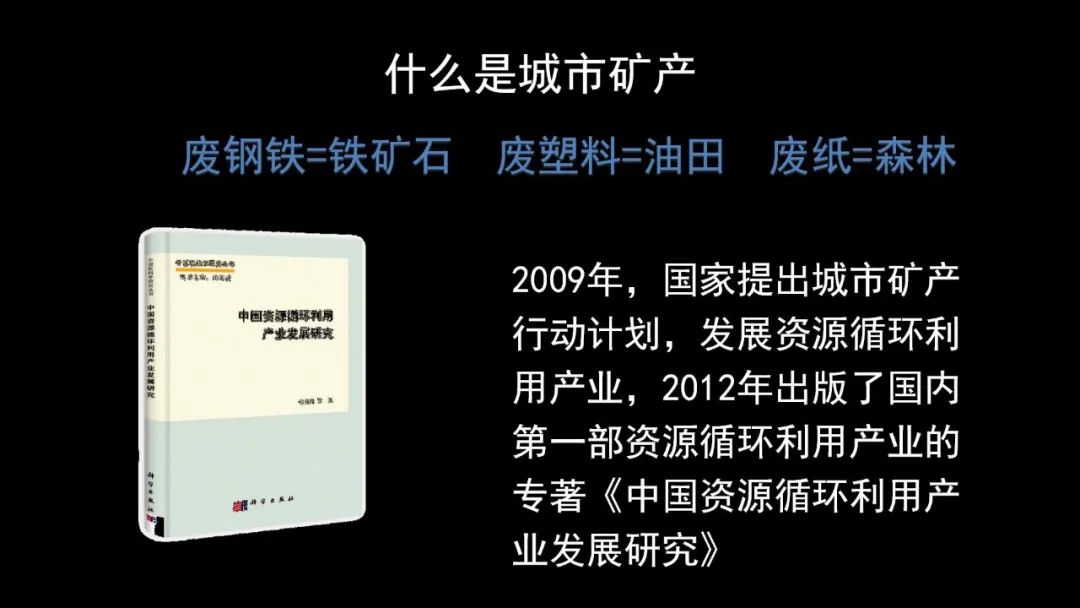 所以我們就提出了一個(gè)概念叫做:城市礦產(chǎn)。我們的礦產(chǎn)在城市里面,我們?cè)谧拿恳晃欢际浅鞘械V產(chǎn)的采掘工,廢鋼鐵就是鐵礦石,廢塑料就是石油,廢紙就是森林,這就是一個(gè)城市礦產(chǎn)的概念。