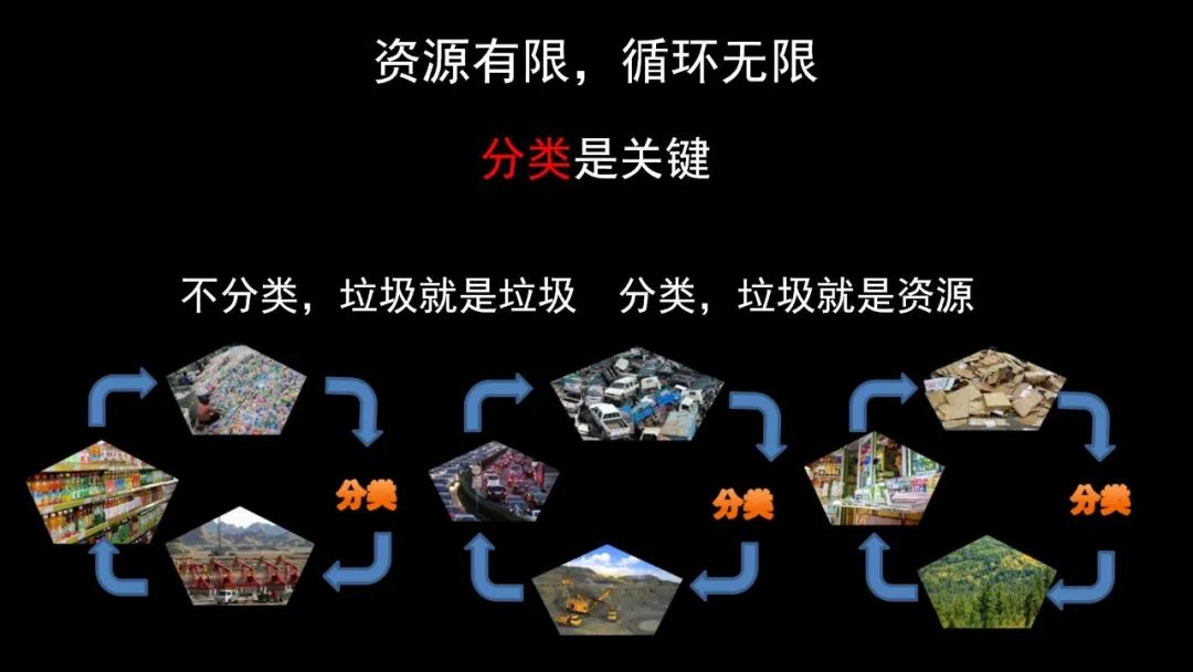 我們延長(zhǎng)資源為人類服務(wù)的時(shí)間,我們不再去地下挖礦,我們?nèi)ネ诔鞘械V產(chǎn),來(lái)自大地,回到大地;來(lái)自產(chǎn)品,回到產(chǎn)品,說(shuō)穿了就是干濕分開。所以現(xiàn)階段對(duì)大家的垃圾分類的要求 就這么簡(jiǎn)單,能不能做到,大家?