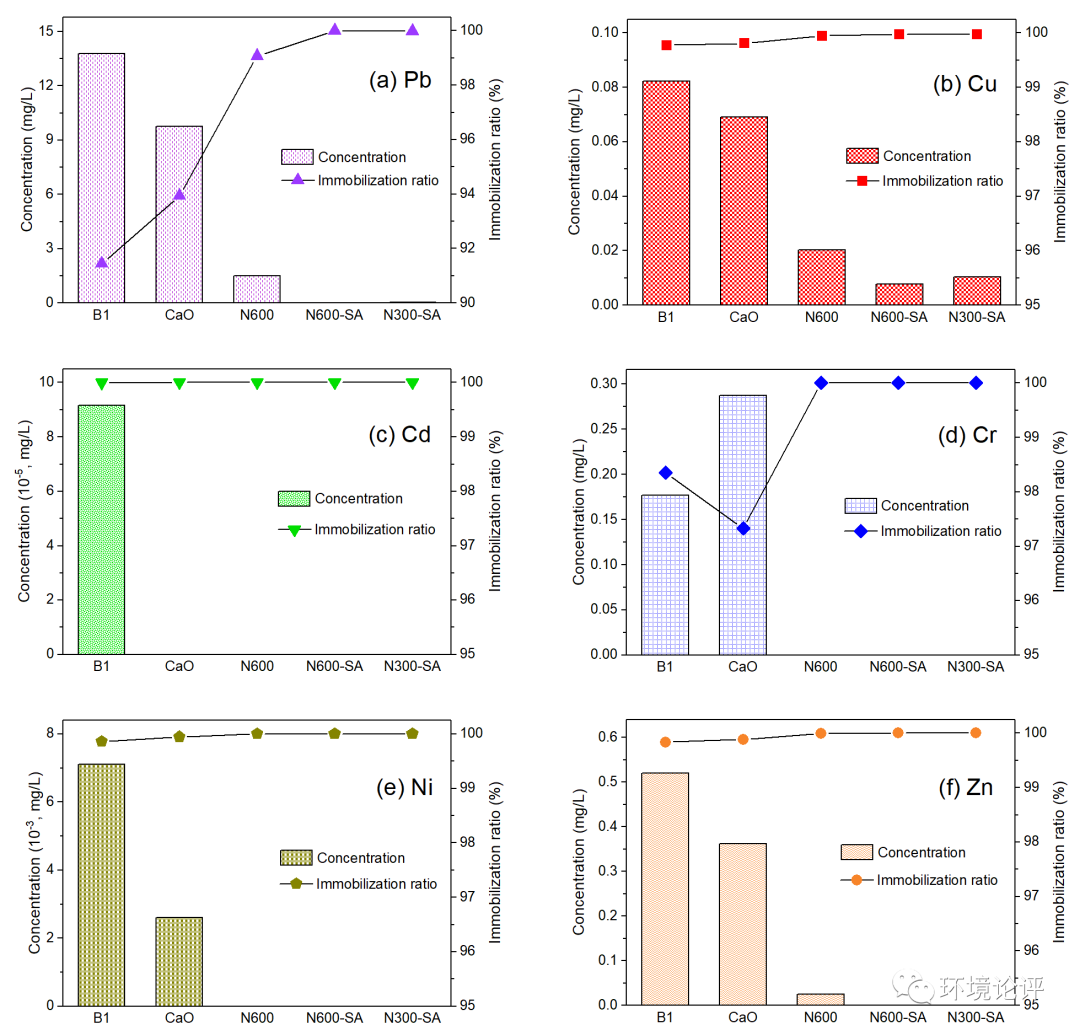 對使用n-Al/CaO固化穩(wěn)定化后的樣品,采用HJ300-2007醋酸緩沖溶液法進行浸出實驗,結果如圖所示。經過固化穩(wěn)定化后各種重金屬的浸出濃度都顯著下降,n-Al/CaO材料效果明顯優(yōu)于未經固化及氧化鈣固化。對銅、鋅、鉻、鎘、鎳、鉛六種重金屬元素的固定效率可達99.9%,在最優(yōu)工藝條件下浸出濃度均可穩(wěn)定控制在生活垃圾填埋場入場要求以下。其中,使用N600SA的實驗組各項結果均為最優(yōu)。