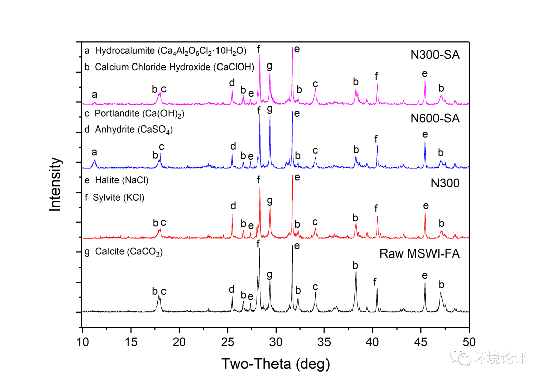 由于飛灰中本就含有煙氣凈化環(huán)節(jié)過量使用的石灰粉/石灰漿,因而飛灰中氧化鈣、氫氧化鈣含量較高,堿性強。對實驗組飛灰的酸中和能力進行測試,使用氧化鈣進行固化穩(wěn)定化的實際是通過增強飛灰體系的堿性,從而實現(xiàn)對重金屬遷移的控制。而使用n-Al/CaO的實驗組變化趨勢與此顯著不同,體系酸堿度隨酸使用量的變化變緩,未出現(xiàn)突變過程,可見體系的緩沖能力增強。在此基礎上對反應后的飛灰礦相進行分析,確認其中生成水鋁鈣石類新礦物。水鋁鈣石作為具有層狀結構的礦物,已被證實具有鈍化重金屬、促進重金屬從可交換態(tài)向碳酸鹽結合態(tài)、鐵錳氧化態(tài)和殘渣態(tài)轉化的性能。