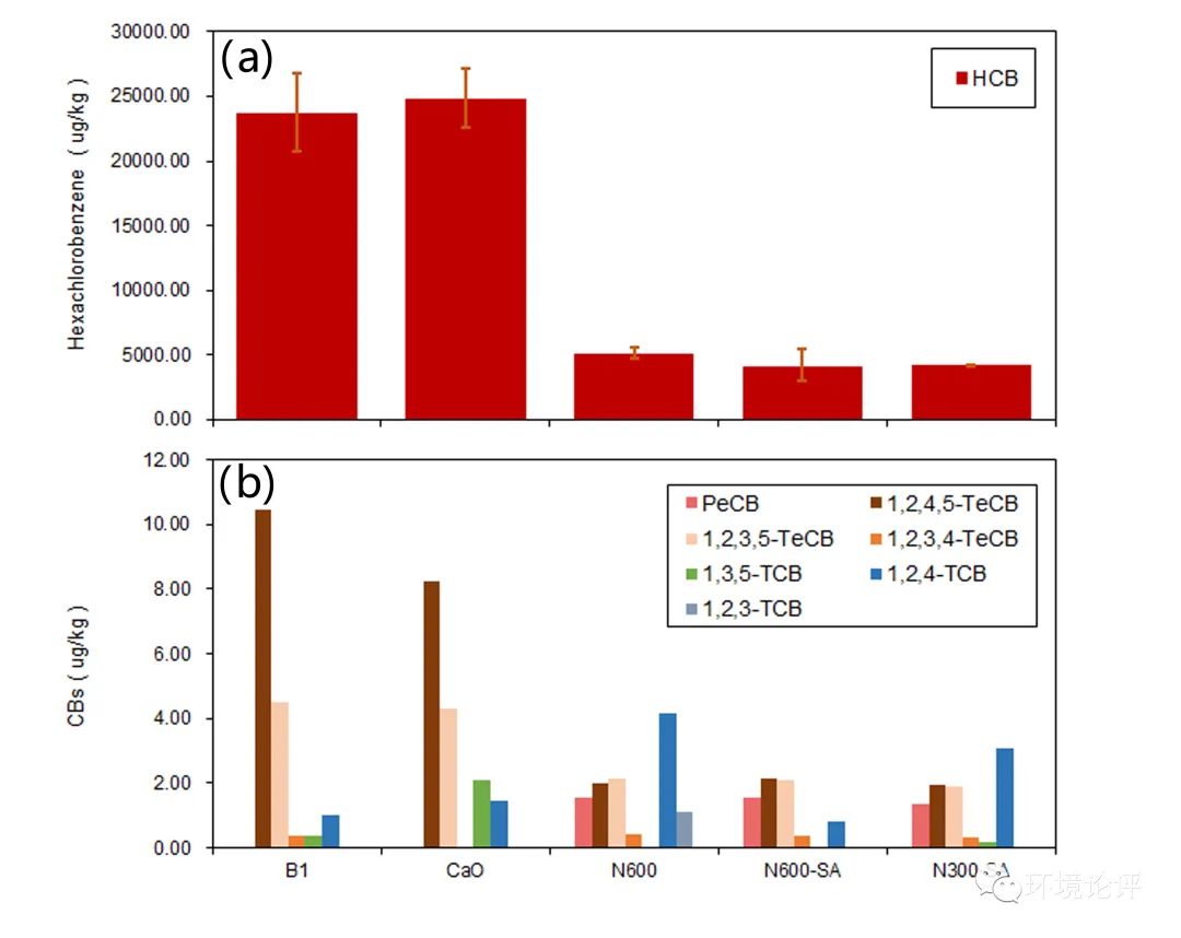 對實驗組的六氯苯及其他氯苯的總量進行測試分析,結果如圖5所示,可見n-Al/CaO對于氯代有機物的去除有較為顯著的效果。相比于未經處理的飛灰樣品和使用CaO進行處理的對照組,實驗組的六氯苯及氯苯類物質總量均有顯著的下降,在最佳實驗組N600SA中超過82.43%的六氯苯被降解去除。