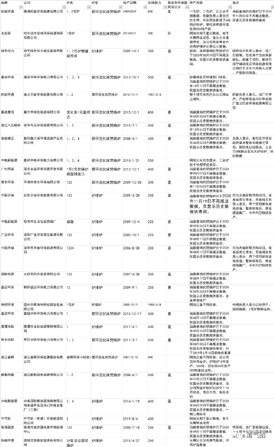 旗下的另一間企業(yè),淮北宇能環(huán)保能源有限公司(800噸處理量,兩臺(tái)循環(huán)流化床)已經(jīng)整體停運(yùn),相關(guān)垃圾處理業(yè)務(wù)也轉(zhuǎn)由該公司在此地遷址重建的新廠(chǎng)——淮北旺能環(huán)保能源有限公司,并已于2020年正式投運(yùn),新廠(chǎng)處理量1500噸,兩臺(tái)750噸爐排爐。錦江環(huán)境:旗下昆明鑫興澤環(huán)境資源產(chǎn)業(yè)有限公司,共有三臺(tái)爐,處理量為1200噸,已于2020年06月02日不再報(bào)送數(shù)據(jù),并已在生態(tài)環(huán)境部生活垃圾焚燒發(fā)電廠(chǎng)自動(dòng)監(jiān)測(cè)信息公示平臺(tái),進(jìn)行了主動(dòng)公示。據(jù)悉,該項(xiàng)目屬于應(yīng)政府要求整體異地搬遷、拆舊換新的項(xiàng)目,且新廠(chǎng)已經(jīng)投運(yùn),新項(xiàng)目的焚燒爐為三臺(tái)750噸爐排爐。不過(guò),研究團(tuán)隊(duì)尚未在公示平臺(tái)查詢(xún)到相關(guān)信息,估計(jì)還是處于試運(yùn)行狀態(tài),相關(guān)煙氣、爐溫、工況等數(shù)據(jù)尚未上網(wǎng)。中國(guó)天楹:旗下啟東和深圳項(xiàng)目,目前均整體停運(yùn),并已在生態(tài)環(huán)境部生活垃圾焚燒發(fā)電廠(chǎng)自動(dòng)監(jiān)測(cè)信息公示平臺(tái),進(jìn)行了主動(dòng)公示。據(jù)悉,兩個(gè)項(xiàng)目都是并購(gòu)項(xiàng)目,前期設(shè)備和環(huán)保設(shè)施欠債較多,需要進(jìn)行就地改造,整體拆除原有設(shè)備,原址新建焚燒爐臺(tái)套產(chǎn)線(xiàn),基本算是原址建造新廠(chǎng),且今年內(nèi)都將陸續(xù)投產(chǎn)。不過(guò),研究團(tuán)隊(duì)尚未在公示平臺(tái)查詢(xún)到相關(guān)信息,估計(jì)還是處于試運(yùn)行狀態(tài),相關(guān)煙氣、爐溫、工況等數(shù)據(jù)尚未上網(wǎng)。偉明環(huán)保:旗下溫州甌海項(xiàng)目,停運(yùn)了一臺(tái)160噸的爐排爐,該爐于2000年投產(chǎn),至今已運(yùn)行20年。綠色動(dòng)力:旗下海寧綠色動(dòng)力再生能源有限公司(處理量六百?lài)?,兩臺(tái)09年投運(yùn)爐排爐)已經(jīng)停運(yùn)。同時(shí),在海寧當(dāng)?shù)亓肀傩轮?,新建了?xiàng)目海寧綠動(dòng)海云環(huán)保能源有限公司,已于今年六月投入運(yùn)營(yíng),新項(xiàng)目處理量為1500噸,兩臺(tái)750噸爐排爐。相關(guān)信息已在生態(tài)環(huán)境部生活垃圾焚燒發(fā)電廠(chǎng)自動(dòng)監(jiān)測(cè)信息公示平臺(tái),進(jìn)行了主動(dòng)公示。停運(yùn)詳細(xì)信息詳見(jiàn)下圖: