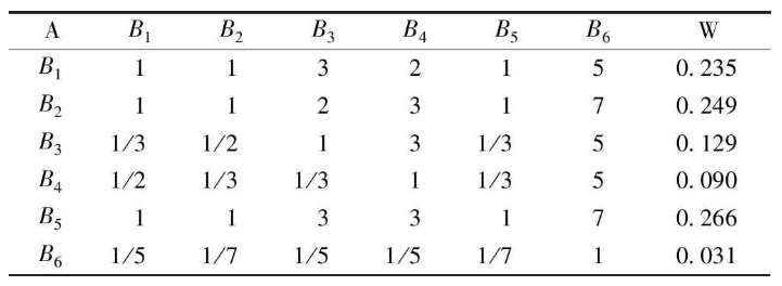 4)層次單排序。對上層次中某元素而言,確定本層次與之間有聯(lián)系的各元素重要性次序的權(quán)重值,是層次總排序的基礎(chǔ)。這一層次計算矩陣的特征根和特征向量,計算出最大特征根,再計算權(quán)重值。為了使矩陣合理化,需要進行一致性檢驗。計算出的一致性指標要與表2中RI平均一致性指標比較。其中的比值CR若<0.1,則矩陣具有一致性;若>0.1,則矩陣需要進行調(diào)整滿足一致性。