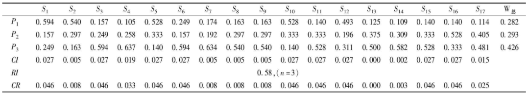 5)層次總排序。計算所有元素的權(quán)重值,對每個層次進行逐層排序。判斷層次總排序是否具有一致性,也需要進行一致性檢驗。