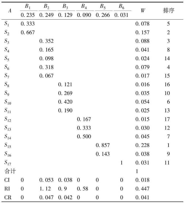 通過公式計算出:準則層B對子準則層S的判斷矩陣B1-S1-2、B2-S3-7、B3-S8-11、B4-S12-14、B5-S15-16、B6-S17,如表5所示??芍簩π迯陀绊懽畲蟮氖俏廴疚镱愋停錂?quán)重為0.228。其次,地質(zhì)條件在修復過程中也有重要的影響,其權(quán)重為0.157。修復過程中的技術(shù)成熟度也相當重要,其權(quán)重為0.088;修復過程中技術(shù)可實施性也存在影響,其權(quán)重為0.079;修復中的水文條件也是一個因素,其權(quán)重均為0.078;在修復過程中設(shè)備投資也有一定影響作用,其權(quán)重為0.054;修復中也要注意水資源的保護,其權(quán)重為0.045;在修復中,修復周期也有影響,其權(quán)重為0.041。污染物濃度、后期管理費用、pH、生態(tài)保護也起到一定作用,其權(quán)重分別為0.038、0.035、0.031、0.030。當然,在修復過程也要注意運行成本、修復效率、工人健康安全、監(jiān)測費用、副產(chǎn)品危害等問題,其權(quán)重分別為0.025、0.024、0.017、0.016、0.015。表5 層次總排序