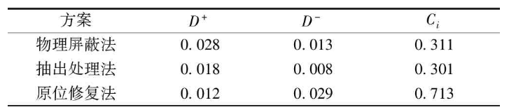 根據(jù)相對接近度確定修復方案優(yōu)劣排序,由表7可看出:相對接近度Ci(原位修復法)>Ci(物理屏蔽法)>Ci(抽出處理法),所以原位修復法在該地區(qū)更適合地下水鉛的修復。目標層對方案層的分析優(yōu)化矩陣也表明,在技術(shù)條件中的技術(shù)成熟度、修復周期、技術(shù)可實施性、工人健康安全方面,原位修復技術(shù)比抽出處理法和物理屏蔽法更適宜。通過最后指標權(quán)重的優(yōu)劣排序,也可以看出原位修復技術(shù)更具有優(yōu)勢,比較適合該地區(qū)地下水鉛的修復。