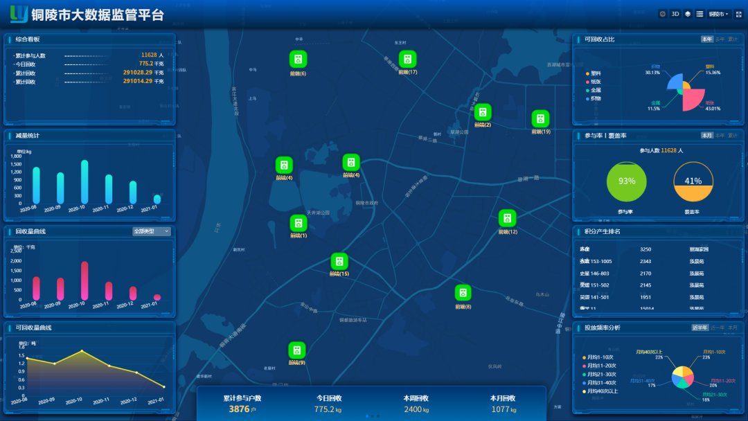 八個(gè)月來,廚余垃圾分出量增長了12.7倍,廚余垃圾分出率達(dá)到21.78%。垃圾分類社會(huì)動(dòng)員成效明顯,居民知曉率平均為94.85%,參與率74.12%,正確投放率達(dá)到69.38%。2020年6月1日,銅陵正式實(shí)施《銅陵市生活垃圾分類管理?xiàng)l例》條例規(guī)定,鼓勵(lì)探索采用智能回收平臺(tái)等方式,提高生活垃圾分類投放的準(zhǔn)確率。鼓勵(lì)再生資源回收利用企業(yè)建立再生資源回收利用信息化平臺(tái),向社會(huì)公眾提供預(yù)約回收服務(wù)以及可回收物目錄、回收價(jià)格、回收方式等信息。