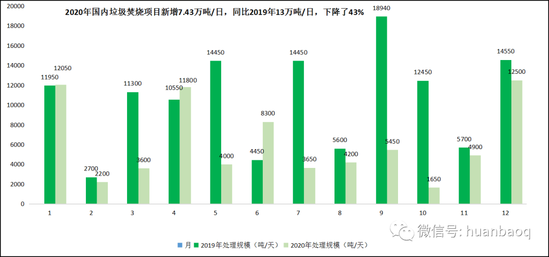 稍加留意就會(huì)發(fā)現(xiàn),相較于前兩年的大項(xiàng)目頻現(xiàn),各家企業(yè)中標(biāo)捷報(bào)頻傳,2020年類似的報(bào)道少了許多,全國(guó)釋放的垃圾焚燒項(xiàng)目罕見下滑,新增項(xiàng)目開始“降溫”。這一現(xiàn)象,筆者早在去年6月就注意到了,當(dāng)時(shí)還以為是受疫情的影響,但其實(shí)大家都想錯(cuò)了。據(jù)筆者長(zhǎng)期跟蹤各省政府采購(gòu)網(wǎng)統(tǒng)計(jì)得出,2020年1月-12月,國(guó)內(nèi)新中標(biāo)的垃圾焚燒發(fā)電項(xiàng)目累計(jì)72個(gè),相比2019年新中標(biāo)120個(gè)項(xiàng)目減少48個(gè),同比下滑了40%;新增日處理規(guī)模7.43萬(wàn)噸/日,相比2019年近13萬(wàn)噸/日的新增規(guī)模,同比減少了43%;總投資373億元,相比2019年總投資600億元也減少了227億元,降幅達(dá)到37.83%。(項(xiàng)目清單詳見文末)看得出來(lái),2020年國(guó)內(nèi)釋放的垃圾焚燒項(xiàng)目,無(wú)論是中標(biāo)數(shù)量,還是日處理規(guī)模,亦或是總投資額,與2019年相比都有4-5成左右的下滑,下降的不是一點(diǎn)點(diǎn),而是幾乎“腰斬”。從月份來(lái)看,除了1月、4月、6月,2020年新增的日處理規(guī)模較2019年有所增長(zhǎng)外,其余每個(gè)月份都有著不同程度的下滑,少則3-6千噸/日,多則上萬(wàn)噸/日。其中,5月、7月、9月、10月四個(gè)月的下降幅度最大,均是萬(wàn)噸/日級(jí)別以上的減少。(如圖一、圖二所示)圖一:2019年VS2020年,全國(guó)釋放的垃圾焚燒項(xiàng)目規(guī)模對(duì)比圖二:2020年國(guó)內(nèi)垃圾焚燒項(xiàng)目新增7.43萬(wàn)噸/日,同比下降了43%02