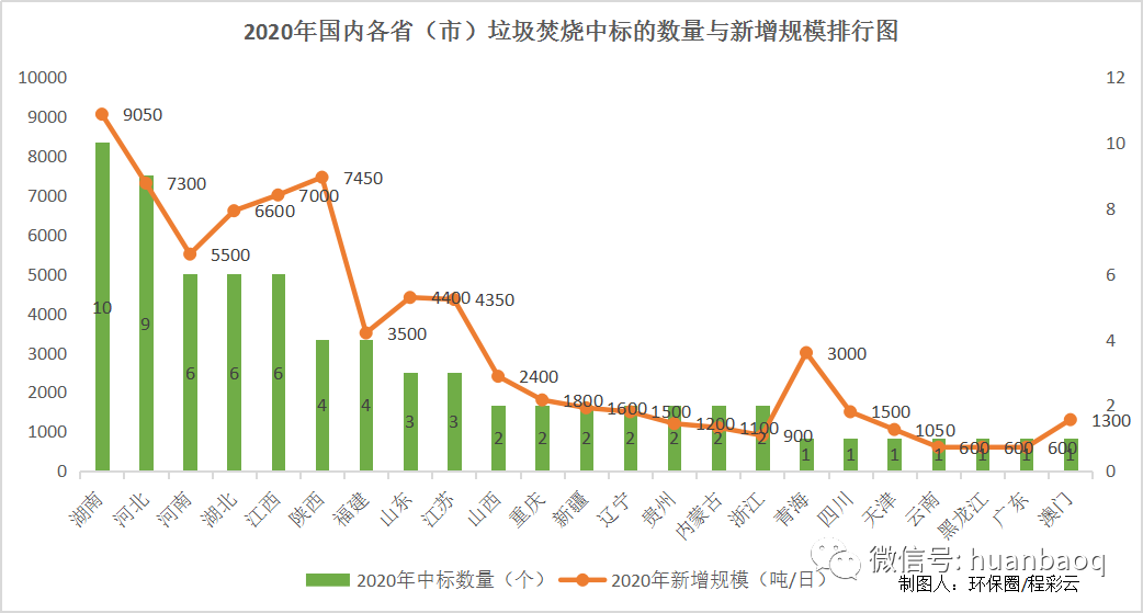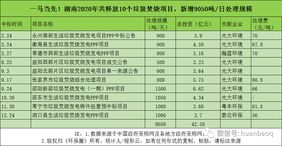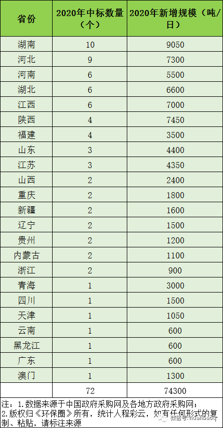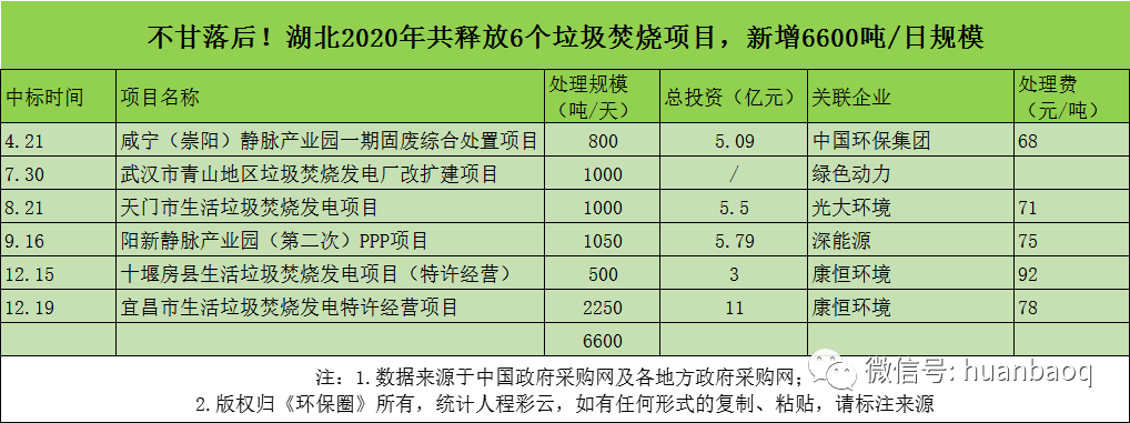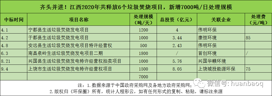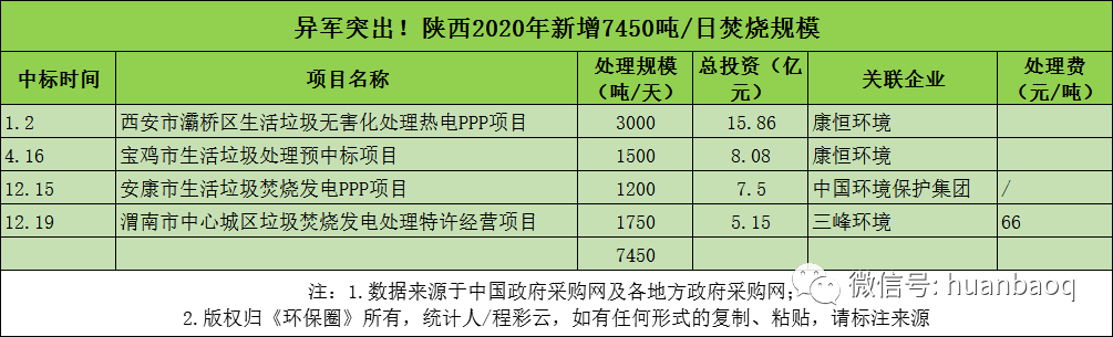 從項(xiàng)目分布的省份來(lái)看,2020年定標(biāo)的72個(gè)垃圾焚燒項(xiàng)目,分別分布在湖南、湖北、河南、河北、江西、陜西、福建、山東、江蘇等23個(gè)省市,其中湖南、湖北、江西、陜西在垃圾焚燒領(lǐng)域大放異彩,成為全國(guó)興建垃圾焚燒廠數(shù)量最多、新增規(guī)模最大的4個(gè)省份(如圖三、圖四所示)。圖三:2020年定標(biāo)的72個(gè)垃圾焚燒項(xiàng)目,分布的省市圖四:2020年國(guó)內(nèi)各?。ㄊ校├贌袠?biāo)的數(shù)量、新增規(guī)模排行但與此同時(shí),總體上看,2020年國(guó)內(nèi)絕大多數(shù)地區(qū)垃圾焚燒投資速度都是在放緩的,政府招投標(biāo)活動(dòng)不及2019年,下滑幅度最大的是“冀魯豫”三省。以河南為例,2019年河南省累計(jì)開標(biāo)26個(gè)垃圾焚燒項(xiàng)目,新增處理規(guī)模3.22萬(wàn)噸/日;而到了2020年,則只有6個(gè)垃圾焚燒項(xiàng)目完成評(píng)標(biāo),新增處理規(guī)模5500噸/日,只有2019年的“零頭”。在河北,2019年全省新增21個(gè)垃圾焚燒項(xiàng)目,新增處理規(guī)模2.51萬(wàn)噸/日;而到了2020年,這一數(shù)據(jù)則下滑到9個(gè)項(xiàng)目,新增處理規(guī)模7300噸/日,不足2019年的1/3。還有山東省,2019年山東全省共有11座垃圾焚燒項(xiàng)目完成定標(biāo)工作,新增處理規(guī)模近萬(wàn)噸/日;而2020年,山東則只有3個(gè)垃圾焚燒項(xiàng)目開啟招標(biāo),新增規(guī)模不及2019年的一半。與以上這些省份相比,“兩湖兩西”--湖南、湖北、山西、陜西4省,則在其他省市投資速度放緩時(shí)“”異軍突起,不懼國(guó)補(bǔ)滑坡的負(fù)面效應(yīng),在2020年迎來(lái)了垃圾焚燒市場(chǎng)的大爆發(fā)。4省之中,湖南省“一馬當(dāng)先”。省內(nèi)永州、常德、益陽(yáng)、張家界、常寧、邵陽(yáng)等城市紛紛開啟招投標(biāo)工作,2020年共有10個(gè)垃圾焚燒項(xiàng)目完成定標(biāo),新增9050噸/日的處理規(guī)模,僅光大環(huán)境一家就斬獲其中7個(gè)項(xiàng)目,吃掉了70%的市場(chǎng)份額,成為湖南垃圾焚燒市場(chǎng)的“大贏家”(如圖五所示)。湖北也是“不甘落后”。雖然釋放速度不及湖南,但去年也是新增了6個(gè)垃圾焚燒大標(biāo),其中4個(gè)都是千噸級(jí)別的項(xiàng)目,宜昌市垃圾焚燒項(xiàng)目更是難得一見2250噸/日的大項(xiàng)目,吸引了光大環(huán)境、中國(guó)環(huán)境保護(hù)集團(tuán)、綠色動(dòng)力、深能、康恒環(huán)境等固廢大咖前來(lái)競(jìng)標(biāo)(如圖六所示)。圖六:2020年湖北省垃圾焚燒項(xiàng)目新增情況還有江西省。據(jù)《環(huán)保圈》跟蹤發(fā)現(xiàn),2019年江西垃圾焚燒新增規(guī)模共計(jì)3400噸/日,而2020年這一數(shù)據(jù)則攀升至7000噸/日,其中5個(gè)垃圾焚燒項(xiàng)目都是千噸級(jí)別以上(如圖七所示)。圖七:2020年江西省垃圾焚燒項(xiàng)目新增情況增長(zhǎng)最明顯還屬陜西省。據(jù)《環(huán)保圈》進(jìn)一步跟蹤,2019年陜西境內(nèi)大多生活垃圾還靠填埋,垃圾焚燒普及率非常低,鄰避矛盾突出。而到了2020年,西安灞橋區(qū)、寶雞市、安康市、渭南中心城區(qū)等地紛紛開啟項(xiàng)目招投標(biāo)工作,雖然只有4個(gè)項(xiàng)目完成了定標(biāo)工作,但處理規(guī)模也一躍達(dá)到7500噸/日,僅次于湖南(如圖八所示)。圖八:2020年陜西省垃圾焚燒項(xiàng)目新增情況03