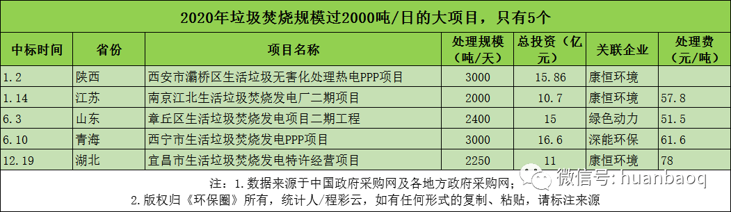 先是水務(wù)巨頭三峽集團(tuán)旗下子公司在湖北宜昌15天內(nèi)接連中標(biāo)2個(gè)垃圾焚燒發(fā)電訂單,高調(diào)“跨界”;緊接著半路出家、轉(zhuǎn)型不到3年的城發(fā)環(huán)境又要合并老牌環(huán)企啟迪環(huán)境,試圖打造黃河流域高質(zhì)量環(huán)保發(fā)展平臺(tái);然后“康恒僑銀”CP組合又從中國(guó)天楹、高能環(huán)境、偉明環(huán)保等一眾固廢名企中脫穎而出,中標(biāo)近5億元的湖北利川垃圾收集和焚燒發(fā)電一體化項(xiàng)目;最后,背靠浙江國(guó)資的浙能電力還擬以20.40元/股的價(jià)格,收購(gòu)康恒環(huán)境最高5.9%的股權(quán)。“市場(chǎng)可以公開競(jìng)標(biāo)的項(xiàng)目一年比一年少,有些固廢名企的市場(chǎng)投資部都撤銷了,所以別再說(shuō)什么垃圾焚燒項(xiàng)目‘跑馬圈地’了,都快沒‘地’可圈了?!?/span>某固廢企業(yè)市場(chǎng)投資部經(jīng)理表示。垃圾焚燒項(xiàng)目為啥少了?日處理規(guī)模數(shù)據(jù)為啥出現(xiàn)“斷崖式下滑”?市場(chǎng)真的沒“地”可圈了嗎?接下來(lái),筆者將從項(xiàng)目分布的省份、日處理規(guī)模、總投資、中標(biāo)企業(yè)、處理費(fèi)等五大角度,通過(guò)大數(shù)據(jù)來(lái)解析一下2020國(guó)內(nèi)垃圾焚燒行業(yè)的四大特征,從而解釋之前高速增長(zhǎng)的垃圾焚燒行業(yè)為何會(huì)在2020年迎來(lái)拐點(diǎn)?是“國(guó)補(bǔ)新政”惹得禍,還是市場(chǎng)真實(shí)需求在下滑?并提出“十四五”期間國(guó)內(nèi)垃圾焚燒市場(chǎng)發(fā)展的幾點(diǎn)建議,供大家參考。01