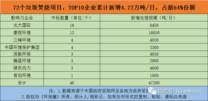 一家獨(dú)大,多強(qiáng)并進(jìn)!說(shuō)到行業(yè)集中度,先回顧一下2019年的情況。在2019年釋放的120個(gè)垃圾焚燒項(xiàng)目中,光大環(huán)境、康恒環(huán)境、中國(guó)環(huán)境保護(hù)、首創(chuàng)環(huán)境等業(yè)內(nèi)影響力企業(yè)累計(jì)中標(biāo)60座垃圾焚燒項(xiàng)目,占比全國(guó)新增項(xiàng)目的50%,日處理規(guī)模高達(dá)66550噸,約占全國(guó)新增處理規(guī)模的52%。僅光大環(huán)境一家,就“吃掉”了全國(guó)22%的份額。2019年斬獲22個(gè)項(xiàng)目新增2.87萬(wàn)噸/日規(guī)模,約占2019年全國(guó)新增處理規(guī)模的22%,在國(guó)內(nèi)垃圾焚燒版圖中,已經(jīng)實(shí)現(xiàn)了“五分天下有其一”。據(jù)筆者進(jìn)一步觀察,2020年定標(biāo)的72個(gè)垃圾焚燒項(xiàng)目,還是被業(yè)界熟知的康恒環(huán)境、光大環(huán)境、偉明環(huán)保、海螺投資、三峰環(huán)境、綠色動(dòng)力、中國(guó)環(huán)境保護(hù)等在內(nèi)22家固廢龍頭企業(yè)“瓜分”(如圖十所示)。圖十:22家固廢龍頭企業(yè)“瓜分”72個(gè)垃圾焚燒項(xiàng)目有意思的是,與2019年相比,2020年絕大多數(shù)固廢企業(yè)拿單能力減弱,比如光大環(huán)境,2019年入手了22個(gè)項(xiàng)目,新增2.87萬(wàn)噸/日的焚燒規(guī)模;而到了2020年則只斬獲了10個(gè)項(xiàng)目,新增規(guī)模不足1萬(wàn)噸/日,約8450噸/日,且集中在湖南地區(qū)。再比如城發(fā)環(huán)境,受河南垃圾焚燒市場(chǎng)的萎縮,城發(fā)環(huán)境2020中標(biāo)的垃圾焚燒項(xiàng)目減少了一半,只拿到5個(gè)項(xiàng)目,其中有4個(gè)位于河南,還有1個(gè)選址新疆昌吉市。值得一提,在其他家企業(yè)投資放緩時(shí),業(yè)界“黑馬”康恒環(huán)境則逆勢(shì)崛起,首超光大環(huán)境,2020年共獲12個(gè)垃圾焚燒訂單,新增16650噸/日處理規(guī)模,位居行業(yè)首位。繼續(xù)統(tǒng)計(jì)2020年業(yè)界十大影響力企業(yè)所占的市場(chǎng)份額,《環(huán)保圈》發(fā)現(xiàn),2020年這些企業(yè)累計(jì)斬獲40個(gè),占全國(guó)新增項(xiàng)目的57%,較2019提升了7%的增長(zhǎng)點(diǎn),累計(jì)新增規(guī)模高達(dá)4.72萬(wàn)噸/日,占全國(guó)新增規(guī)模64%,較2019提升了13%的增長(zhǎng)點(diǎn)。(如圖十一所示)圖十一:2020年TOP10影響力企業(yè)中標(biāo)數(shù)量、新增規(guī)模這再次印證,在“馬太效應(yīng)”下,垃圾焚燒領(lǐng)域“強(qiáng)者恒強(qiáng)”的局面愈發(fā)凸顯,行業(yè)集中度已由2019年的50%提升至2020的64%,“一家獨(dú)大,多強(qiáng)并進(jìn)”的局面已然形成。所以就不難理解,為何中標(biāo)的企業(yè)總是那幾家了。不過(guò)話說(shuō)回來(lái),即便這些企業(yè)拿單能力突出,跑馬圈地“圈”了許多項(xiàng)目,但并不意味著前途就一片光明,以后發(fā)展就能順風(fēng)順?biāo)恕?/span>挑戰(zhàn)其實(shí)才剛剛開始。或許前不久光大環(huán)境總裁王天義的一番話更能說(shuō)明其中的道理。他說(shuō):受國(guó)內(nèi)市場(chǎng)日趨飽和、PPP模式政府調(diào)價(jià)、國(guó)補(bǔ)退坡、垃圾分類等因素的影響,光大環(huán)境已經(jīng)感覺到“不舒適”了。