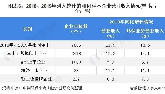 2019年,統(tǒng)計范圍內(nèi)共有7666家企業(yè)同為2018年我國環(huán)保產(chǎn)業(yè)發(fā)展?fàn)顩r的綜合量化分析樣本,與2018年相比,上述企業(yè)的營業(yè)收入增長了11.9%,其中,環(huán)保業(yè)務(wù)營業(yè)收入同比增長13.5%。上述企業(yè)中規(guī)模以上企業(yè)2418家,其營業(yè)收入同比增長12.3%、環(huán)保業(yè)務(wù)營業(yè)收入同比增長14.1%;