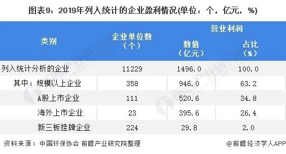 2019年,11229家環(huán)保企業(yè)實現(xiàn)營業(yè)利潤總額1496.0億元,94.7%的營業(yè)利潤集中在年營業(yè)收入1億元以上的企業(yè),營業(yè)收入在2000萬元以下的企業(yè)營業(yè)利潤占比僅0.3%。上述企業(yè)平均利潤率為9.3%,高于2018年全國規(guī)模以上工業(yè)企業(yè)利潤率(6.3%)。