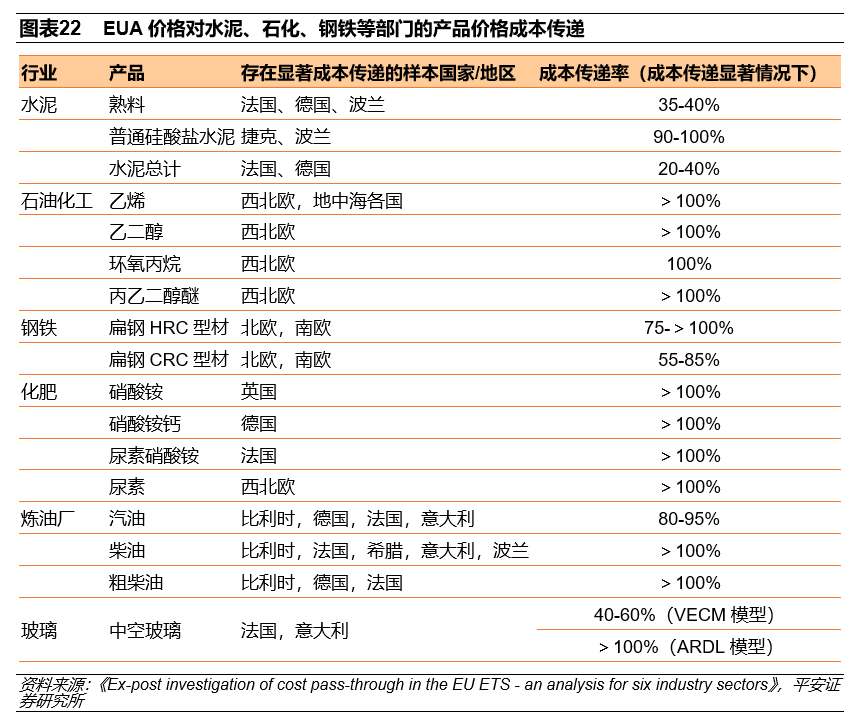 對商品市場而言,碳交易價格與相關(guān)產(chǎn)品價格同向波動,EUA價格作為成本可能傳遞至電力、鋼鐵、水泥、煉油等行業(yè),引發(fā)產(chǎn)品價格相應(yīng)上升。