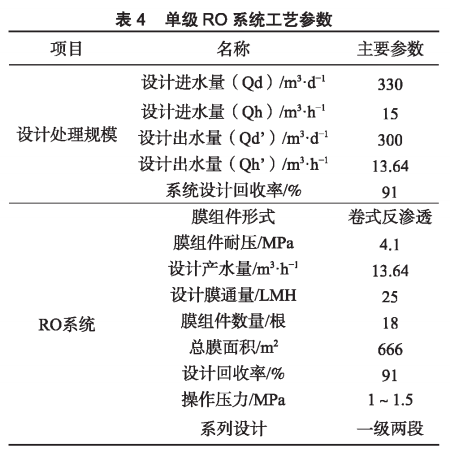 單級(jí)RO主要是針對(duì)兩級(jí)DTRO系統(tǒng)出水氨氮值超過(guò)限值而采取的保安措施,單級(jí)RO系統(tǒng)的主要工藝參數(shù),見(jiàn)表4。