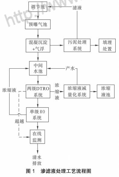 中間水池內(nèi)滲濾液由泵提升進(jìn)入兩級(jí)DTRO系統(tǒng)處理,兩級(jí)DTRO系統(tǒng)前設(shè)置了一套50um的 砂濾系統(tǒng)和一套10um的芯濾系統(tǒng),經(jīng)過(guò)兩級(jí)DTRO處理之后,產(chǎn)水經(jīng)過(guò)在線監(jiān)測(cè)系統(tǒng)達(dá)標(biāo)排放,兩級(jí)DTRO濃縮液進(jìn)入濃縮液減量化系統(tǒng)做減量處理, 濃縮液減量化系統(tǒng)的產(chǎn)水進(jìn)入中間水池,再次進(jìn)入兩級(jí)DTRO系統(tǒng)處理,濃縮液減量化系統(tǒng)的濃縮液排放到濃縮液池暫存。
