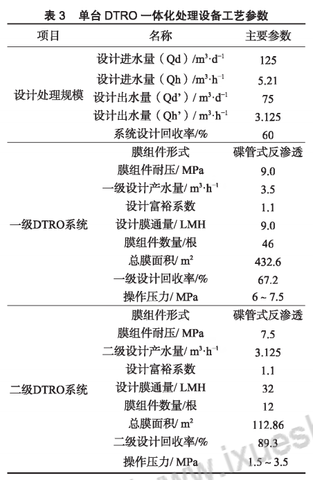 兩級(jí)DTRO系統(tǒng)包含了 4臺(tái)兩級(jí)DTRO 一體化處理設(shè)備,每臺(tái)設(shè)備的主要工藝參數(shù)見(jiàn)表3。