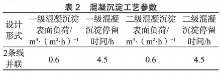 預(yù)處理包含了曝氣改性、兩級(jí)混凝沉淀和混凝氣浮,混凝沉淀的主要工藝參數(shù),見(jiàn)表2。