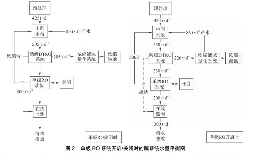 視兩級(jí)DTRO系統(tǒng)出水氨氮是否超標(biāo),選擇是否開(kāi)啟單級(jí)RO系統(tǒng)。當(dāng)兩級(jí)DTRO系統(tǒng)出水氨氮靖,關(guān)閉RO系統(tǒng)此時(shí)系竝體回收率為70.59%;當(dāng)兩級(jí)DTRO出水氨氮值超標(biāo),開(kāi)啟RO系統(tǒng),此 時(shí)系統(tǒng)整體回收率為69.12%。量平衡見(jiàn)圖2。