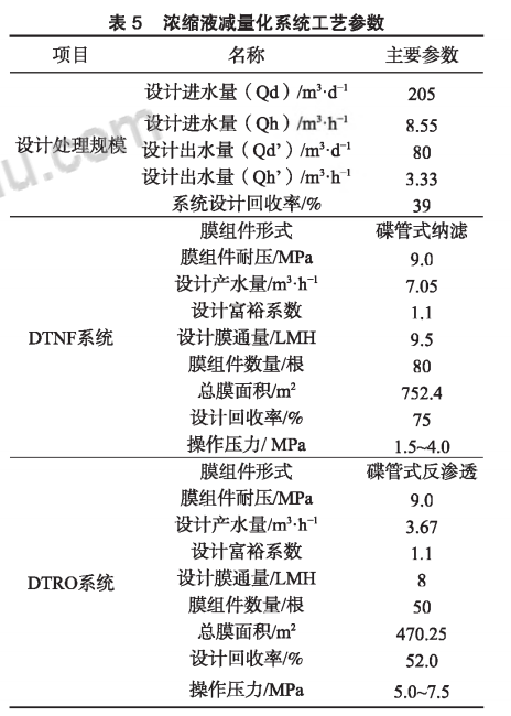 濃縮液減量化系統(tǒng)包含單級(jí)DTNF和單級(jí)DTRO,用于處理兩級(jí)DTRO系統(tǒng)產(chǎn)生的濃縮液, 將兩級(jí)DTRO濃縮液再次濃縮,該套系統(tǒng)內(nèi)的DTRO采用相對(duì)低截留率、高通量的RO膜。濃縮 液減量化系統(tǒng)設(shè)備的產(chǎn)水再進(jìn)入兩級(jí)DTRO設(shè)備中再次處理,能夠?qū)崿F(xiàn)濃縮液的減量,濃縮液減量 化系統(tǒng)的工藝參數(shù)見(jiàn)表5。