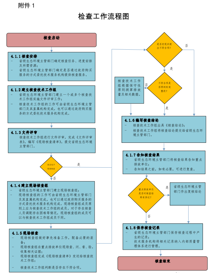 核查程序包括核查安排、建立核查技術(shù)工作組、文件評(píng)審、建立現(xiàn)場(chǎng)核查組、實(shí)施現(xiàn)場(chǎng)核查、出具《核查結(jié)論》、告知核查結(jié)果、存核查記錄等八個(gè)步驟,核查工作流程圖見附件1。
