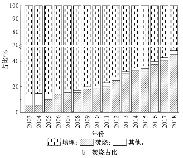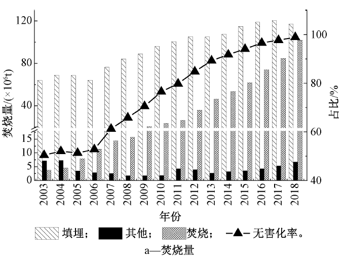 圖1 中國(guó)垃圾焚燒廠建設(shè)規(guī)模2)焚燒量的發(fā)展:隨著垃圾焚燒廠的建設(shè),我國(guó)垃圾無(wú)害化處置能力和處置量不斷提高。2003年我國(guó)垃圾無(wú)害化量為0.75億t,無(wú)害化率為50.4%,到2018年垃圾無(wú)害化量達(dá)到2.26億t,處理率達(dá)到99%(圖2a)。垃圾年焚燒量從2003年的370萬(wàn)t發(fā)展到2018年的1.02億t(圖2a)。垃圾焚燒量占無(wú)害化處理總量的比例從2003年的4.9%發(fā)展到2018年的45.1%。而且根據(jù)行業(yè)估計(jì)到2020年超過(guò)50%(圖2b)。據(jù)此,我國(guó)將很快進(jìn)入“焚燒為主,填埋托底”的垃圾終端處理格局。