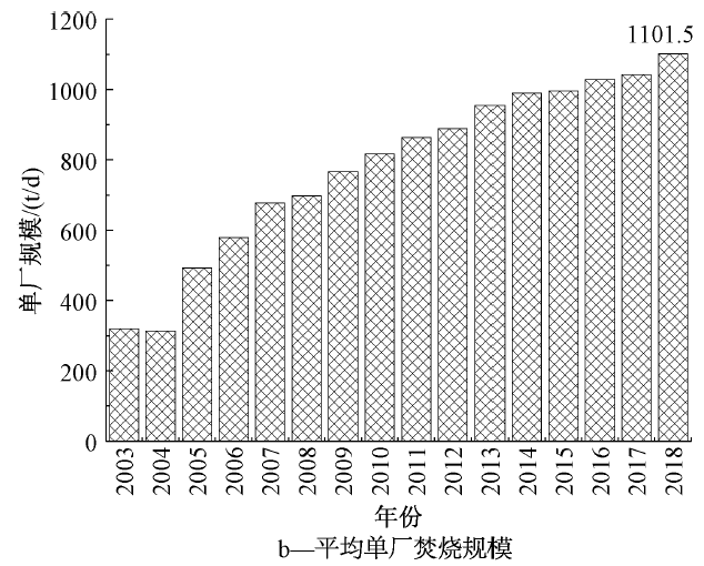 1)焚燒廠建設(shè):中國(guó)垃圾焚燒發(fā)電應(yīng)用始于1989年的深圳,全國(guó)垃圾焚燒廠從2003年的47家發(fā)展到2018年底已建成投入運(yùn)行331座,處置規(guī)模達(dá)到36.36萬(wàn)t/d(合1.33億t/a),見(jiàn)圖1a。另根據(jù)蕪湖生態(tài)中心調(diào)研,2019年4月底有428家垃圾焚燒發(fā)電廠投入運(yùn)行,并且216家正在建設(shè)。平均單廠處理規(guī)模也不斷上升,從2003年的319 t/d發(fā)展到2018年的1101 t/d,見(jiàn)圖1b;同時(shí)單廠最大規(guī)模不斷提高,其中上海于2019年建成6000 t/d的老港再生能源利用中心。