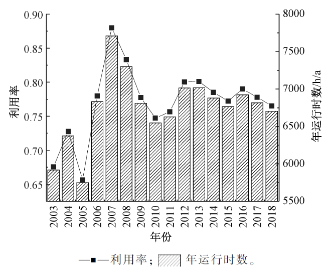 3)焚燒廠實(shí)際運(yùn)行:由于垃圾焚燒廠存在檢修維護(hù)以及部分區(qū)域超前建設(shè)等原因,建設(shè)安裝規(guī)模不等于實(shí)際處理能力。根據(jù)建設(shè)規(guī)模和實(shí)際焚燒量的統(tǒng)計(jì)數(shù)據(jù),折算得到垃圾焚燒廠能力利用率。由圖3可看出:處理能力利用率存在波動(dòng),最高出現(xiàn)在2007年(0.88)。將焚燒量折算到滿負(fù)荷運(yùn)行的小時(shí)數(shù),2007年為7708 h,2018年為6704 h,近10年來(lái)年運(yùn)行平均時(shí)數(shù)均未達(dá)到7200 h。運(yùn)行小時(shí)數(shù)也會(huì)直接影響發(fā)電量。根據(jù)中電聯(lián)網(wǎng)站信息,垃圾焚燒廠2011年聯(lián)網(wǎng)裝機(jī)量為209.7萬(wàn)kW,上網(wǎng)電量為97.23億kW·h,到2018年聯(lián)網(wǎng)裝機(jī)量達(dá)到889萬(wàn)kW,上網(wǎng)電量為481億kW·h,折合節(jié)約標(biāo)煤1480萬(wàn)t(圖4)。入廠垃圾發(fā)電量為300~400 kW·h/t,熱發(fā)電效率為25%~30%。同時(shí)由于各廠技術(shù)、運(yùn)行水平及廠區(qū)建設(shè)差異,廠內(nèi)用電占比為15%~20%,因此上網(wǎng)電量水平為255~340 kW·h/t。根據(jù)浙江省發(fā)改委公布數(shù)據(jù)統(tǒng)計(jì),浙江省內(nèi)垃圾焚燒廠平均上網(wǎng)發(fā)電量287 kW·h/t。國(guó)家發(fā)展改革委《關(guān)于完善垃圾焚燒發(fā)電價(jià)格政策的通知》規(guī)定,生活垃圾焚燒廠生活垃圾折算上網(wǎng)電量暫定為280 kW·h/t,并按照該限值進(jìn)行分類補(bǔ)貼。