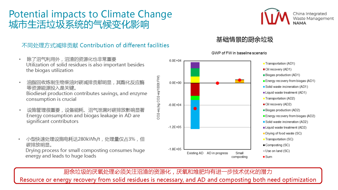 除了這個(gè)之外,我們也對(duì)不同的技術(shù)它的排放強(qiáng)度做了一個(gè)分析。比如剛剛說了,未來垃圾分類要開始了,有些垃圾都要被分出來了,都要處理,不同的處理技術(shù)它的減排貢獻(xiàn)是什么樣的,不同的技術(shù)處理有不同的技術(shù)路線,我們會(huì)分析堆肥,厭氧技術(shù),我們可以看到這個(gè)就是用了經(jīng)典的全生命周期的分析方法,我們委托丹麥科技大學(xué),是丹麥科技大學(xué)他們自行研發(fā)的一個(gè)分析工具,這個(gè)在垃圾領(lǐng)域是非常有名的,也得到了全球的認(rèn)可。在這個(gè)里面我們會(huì)去分析它不同的處理環(huán)節(jié)對(duì)減排的貢獻(xiàn),可以看到有機(jī)垃圾絕對(duì)是非常減排的,但是減排的前提是在于我除了要把沼氣用好之外,沼渣的資源化也非常重要。如果我的有機(jī)垃圾處理完了之后,沼渣要么實(shí)現(xiàn)土地利用,替代一部分的有機(jī)肥,或者回到土地去做碳匯,哪怕從純減排的角度,重新回到焚燒廠焚燒,實(shí)現(xiàn)資源的回收,這兩部分都可以貢獻(xiàn)比較明顯的減排量。但是沼渣處理之后回到填埋場(chǎng),從整個(gè)流程來講,減排的效益沒有那么明顯,可能會(huì)導(dǎo)致一部分負(fù)面的影響。同時(shí)油脂的回收,去做生物柴油,這個(gè)對(duì)減排的貢獻(xiàn)是非常明顯的。