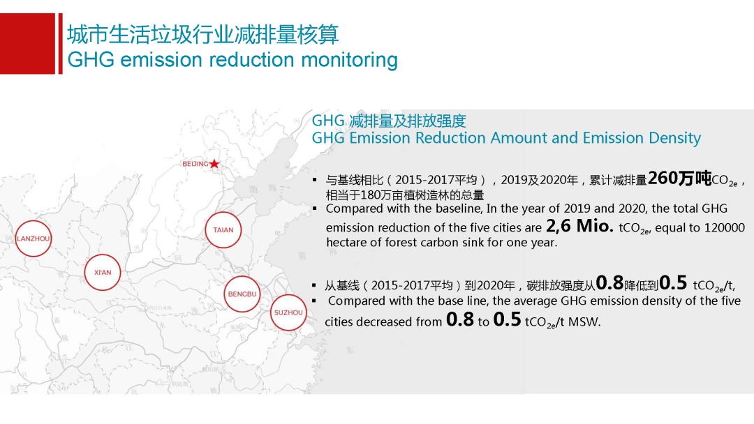這里面也得到了試點(diǎn)城市特別主動(dòng)的支持,在西安他們新建的焚燒廠配備了設(shè)備,這給我們國家的焚燒企業(yè)將來在這個(gè)行業(yè)里面他們的氧化亞氮的排放情況怎么樣,能夠提供第一手的數(shù)據(jù)。在這個(gè)基礎(chǔ)模型的處置上,我們有了幾個(gè)基線選擇,選擇了2015到17年三年的平均值,作為我們整個(gè)項(xiàng)目的基線。在這之后,2019年和2020年我們兩年分別去這五個(gè)城市做了監(jiān)測(cè),可以看出有一些初步的結(jié)論。第一關(guān)于減排量和排放強(qiáng)度,這兩年從19年和20年,與基線相比,五個(gè)城市累計(jì)實(shí)現(xiàn)減排量260萬噸二氧化碳當(dāng)量,這個(gè)相當(dāng)于是180萬畝植樹造林,一年的碳匯地量,也是非常可觀的數(shù)據(jù)。除了排放總量,會(huì)有一個(gè)特別好的數(shù)值就是排放強(qiáng)度,垃圾管理行業(yè)排放強(qiáng)度是多少,從基線值到2020年,我們五個(gè)城市平均碳排放強(qiáng)度從0.8噸二氧化碳當(dāng)量每噸垃圾降到了0.5,能夠看出中國垃圾行業(yè)以五個(gè)試點(diǎn)城市為例,已經(jīng)實(shí)現(xiàn)向低碳化發(fā)展的轉(zhuǎn)型。碳排放強(qiáng)度的降低已經(jīng)達(dá)到了40%以上,能夠看到我們行業(yè)是在更清潔、更低碳,這個(gè)是一個(gè)特別有意義的數(shù)據(jù)。我們也分享給我們總部以及國際同事,他們非常認(rèn)可,能夠看到中國垃圾行業(yè)在向低碳方面轉(zhuǎn)型升級(jí)。