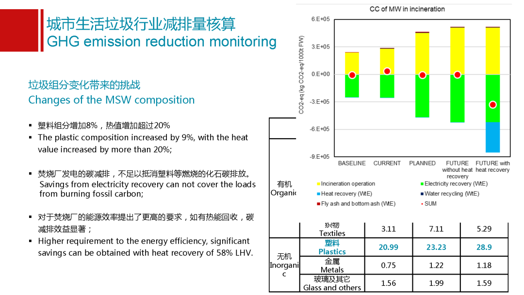 這是以蘇州為例,蘇州做的特別好,他們每年有定期大量的數(shù)據(jù)監(jiān)測(cè),能夠證實(shí)我這個(gè)數(shù)據(jù)的科學(xué)性和可靠性??梢钥吹教K州從17年到19年它的塑料含量增加了8%,這個(gè)可能有比較多的原因。比如生活方式的改變,是不是用了更多的快遞,經(jīng)濟(jì)水平是不是更發(fā)達(dá)了,以及是不是有可能整個(gè)垃圾收運(yùn)管理體系以及環(huán)保要求更高,讓更多的品類進(jìn)入到我的垃圾體系里面來。但是我必須要看到整個(gè)垃圾處理,什么東西進(jìn)到焚燒廠,這個(gè)是有變化的。組分雖然增加了8%,但是對(duì)熱值貢獻(xiàn)是20%,如果焚燒廠不作出相應(yīng)的響應(yīng),不提高能效,之后產(chǎn)生的減排效益不足以抵消新增的塑料產(chǎn)生的排放,焚燒廠需要進(jìn)一步的優(yōu)化。對(duì)焚燒廠的能源效率提出更高的要求,我們初步核算一下,如果一個(gè)焚燒廠在目前我們的垃圾組分的情況下,我們現(xiàn)在五個(gè)城市的焚燒廠基本上都能夠?qū)崿F(xiàn)噸垃圾發(fā)電量400度左右,這個(gè)已經(jīng)很高了,他們的熱效率是在28%,還能夠維持比較好的狀態(tài)。但是如果我們將來熱值或者我的組分還會(huì)進(jìn)一步變化,因?yàn)槔诸愖龅脑絹碓胶茫隙嶂禃?huì)越來越高。我的焚燒廠的能效就要進(jìn)一步提高,否則可能會(huì)從一個(gè)有很好的減排效益的設(shè)施變化成碳排放強(qiáng)度可能是最高的,這個(gè)很重要。對(duì)焚燒廠來講,如果他能夠?qū)崿F(xiàn)熱能回收,就像我們上面那個(gè)圖,會(huì)給出一些建議。提高發(fā)電效率很重要,但是電和熱的回收能夠?qū)崿F(xiàn)更高的能效的利用,可能就會(huì)有更好的減排效益,這也是在焚燒企業(yè)將來去做發(fā)展戰(zhàn)略的時(shí)候需要重點(diǎn)考慮的一個(gè)問題。