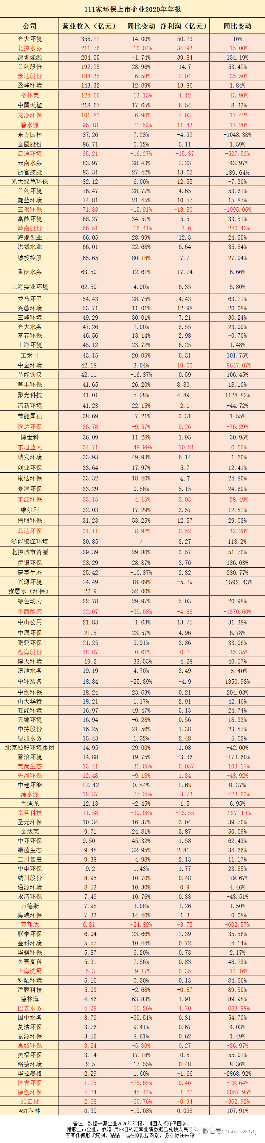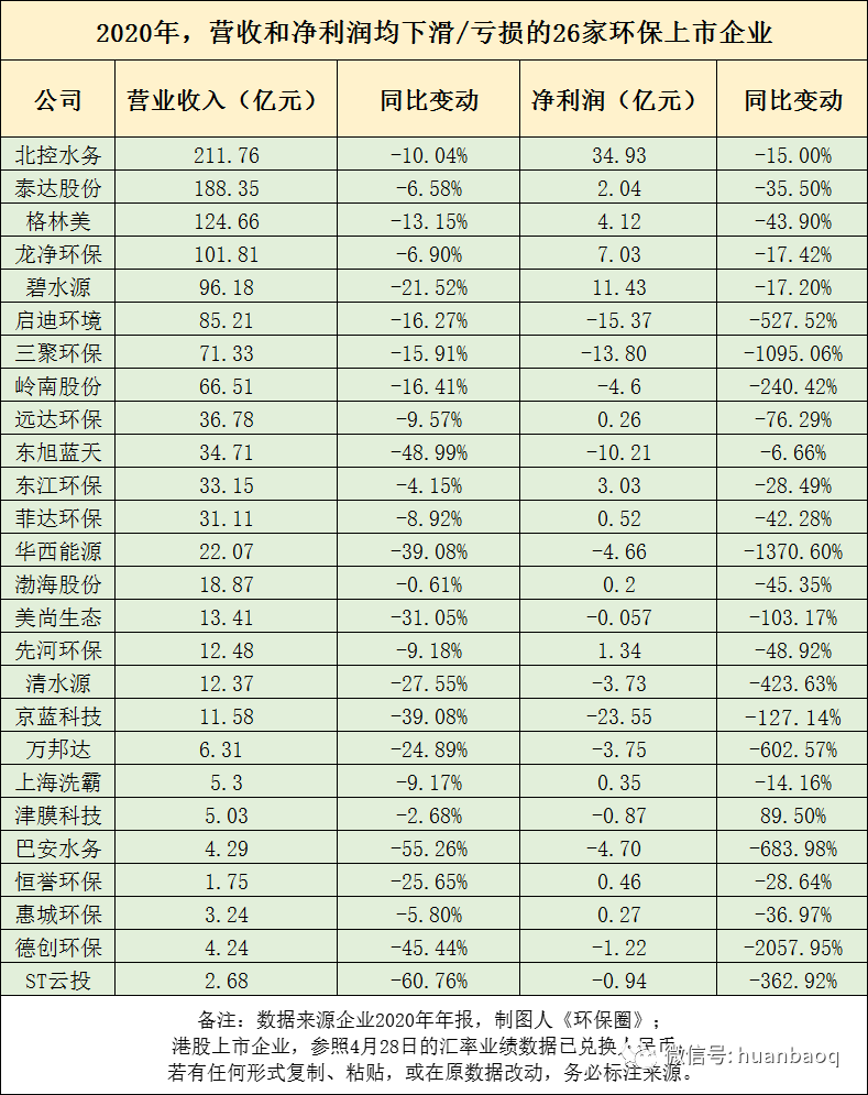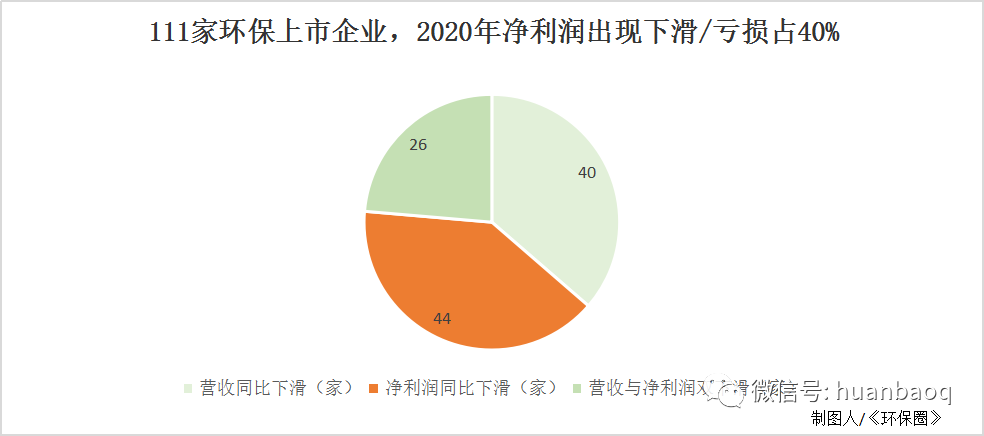 早在3月初,《環(huán)保圈》就已經(jīng)對55家環(huán)保上市企業(yè)的2020年業(yè)績預(yù)告進(jìn)行了統(tǒng)計(jì)分析,結(jié)果發(fā)現(xiàn),55家企業(yè)中,有6成企業(yè)2020年歸母凈利潤實(shí)現(xiàn)正增長,4成企業(yè)表現(xiàn)不理想,歸母凈利潤負(fù)增長,甚至虧損。如果將55家環(huán)保上市企業(yè)范圍擴(kuò)大2倍,增加到111家,總體情況是否會發(fā)生變化呢?據(jù)《環(huán)保圈》繼續(xù)跟蹤統(tǒng)計(jì),截止到5月6日,A股/港股已有111家環(huán)保上市企業(yè)如期完成了2020年年報(bào)的披露工作(業(yè)績?nèi)珗D附文末),這些上市企業(yè)業(yè)務(wù)涉及環(huán)境監(jiān)測、生態(tài)修復(fù)、垃圾焚燒、環(huán)衛(wèi)、危險(xiǎn)廢物、污水處理、供水等各個(gè)環(huán)保細(xì)分板塊,基本可以說明環(huán)保行業(yè)的整體情況。總體來看,111家上市環(huán)企中,約有6成企業(yè)2020年?duì)I業(yè)收入和歸母凈利潤均實(shí)現(xiàn)正向增長,4成的企業(yè)要么是營收下滑,要么是歸母凈利潤虧損。圖一:111家環(huán)保上市企業(yè),2020年凈利潤出現(xiàn)下滑/虧損占40%進(jìn)一步觀察,營收和凈利潤表現(xiàn)均差的26家上市環(huán)企,不乏有排名非常靠前的細(xì)分領(lǐng)域的龍頭,如北控水務(wù)、格林美、碧水源、啟迪環(huán)境、東江環(huán)保等。去年業(yè)績罕見出現(xiàn)大“變臉”,足以說明了2020年,在國內(nèi)外疫情的沖擊下,即便是細(xì)分領(lǐng)域的優(yōu)秀老兵,也有“馬失前蹄”的時(shí)候,好的不好,差的更差,掘金綠水青山比想象中的要難(如圖二所示)!圖二:2020年,營收和凈利潤均下滑/虧損的26家環(huán)保上市企業(yè)營收榜:光大環(huán)境穩(wěn)居第一,百億企業(yè)3家“掉隊(duì)”