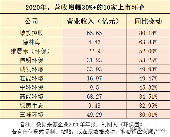 就營收增速而言,2020年,111家環(huán)保上市企業(yè)營收增速30%以上的,只有為數(shù)不多的10家。(如圖五所示)2019年這個(gè)數(shù)字還是23家,同比下降了56%。城投控股、德林海、雅居樂(環(huán)保)、城發(fā)環(huán)境、旺能環(huán)境、中環(huán)環(huán)保、高能環(huán)境、綠茵生態(tài)、三峰環(huán)境等企業(yè)都在高增長之列,而且這些企業(yè)從事業(yè)務(wù)大都與固廢相關(guān)。雅居樂不得不提。作為房企跨界入局環(huán)保的典范,旗下的環(huán)保集團(tuán),2020年面對來勢洶洶的疫情,即便身處競爭較為激烈,處理費(fèi)大不如從前的危廢處置行業(yè),2020全年?duì)I收及毛利依然實(shí)現(xiàn)高速增長,值得點(diǎn)贊。高能環(huán)境非常優(yōu)秀,作為業(yè)內(nèi)20強(qiáng)為數(shù)不多上市民企,即未被產(chǎn)業(yè)寒冬和疫情的危機(jī)形勢打倒,還能從一批國資、央企中廝殺成功上位,自2014年上市以來,連續(xù)6年?duì)I收保持30%以上的增長。同樣還有低調(diào)行事的偉明環(huán)保,不僅資產(chǎn)負(fù)債率在行業(yè)內(nèi)處于較低水平(多數(shù)垃圾焚燒投資運(yùn)營企業(yè)資產(chǎn)負(fù)債率60%-75%,而偉明環(huán)保今年一季度資產(chǎn)負(fù)債率只有47.5%),而且自2011年上市以來,凈利潤已由2011年的6973萬元攀升至12.57億元,歸母凈利潤連續(xù)9連增,復(fù)合增長率達(dá)到37.89%,遠(yuǎn)高于同行水平。圖五:營收增幅30%+的10家上市環(huán)企相比上述企業(yè)的出彩表現(xiàn),接下來圖六表格中的ST云投、巴安水務(wù)、東旭藍(lán)天、華西能源、國中水務(wù)、清水源等10家上市環(huán)企的表現(xiàn)則不盡如意,2020年?duì)I業(yè)收入下滑較為嚴(yán)重,降幅最大的前三分別是ST云投、巴安水務(wù)、東旭藍(lán)天。圖六:營收同比下滑較為嚴(yán)重的10家上市環(huán)企凈利潤榜:半數(shù)位于億元以下,東方園林等增收不盈利
