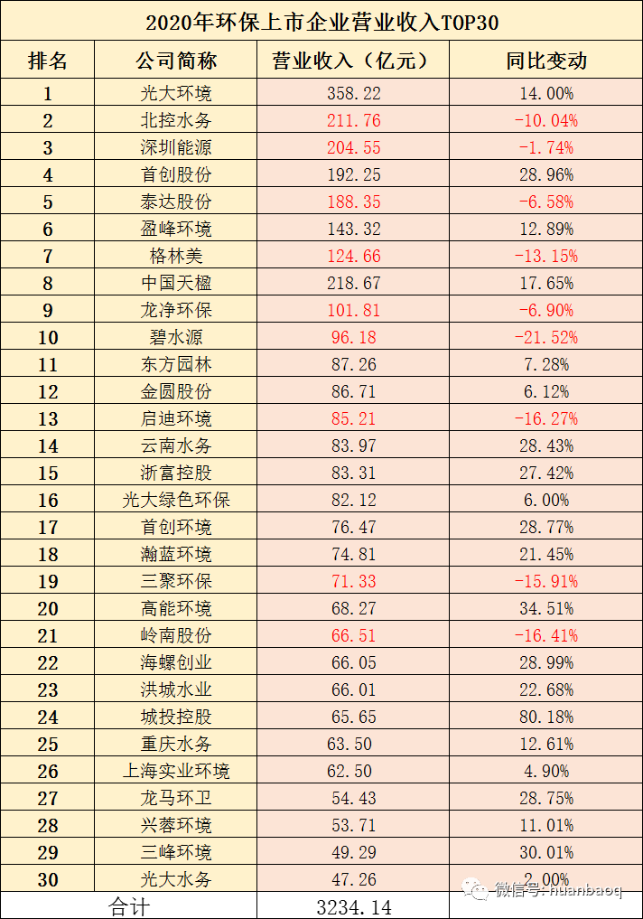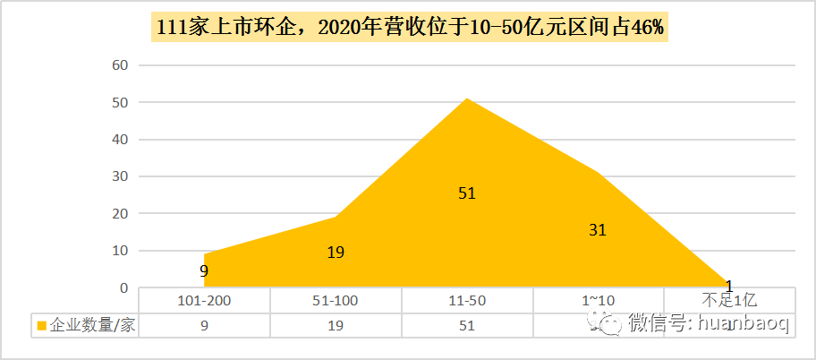 111家環(huán)保上市企業(yè),2020年?duì)I收實(shí)現(xiàn)正向增長有71家,約占64%,這一比例相較于2019年下降了16%,遠(yuǎn)低于預(yù)期,再次印證了去年疫情對我國環(huán)保產(chǎn)業(yè)沖擊。從營收分布區(qū)間來看,111家上市環(huán)企中,突破百億大關(guān)的有9家,分別是光大環(huán)境(358.22億元,14%)、北控水務(wù)(211.76億元,-10.04%)、深圳能源(204.55億元,-1.74%)、首創(chuàng)股份(192.25億元,28.96%)、泰達(dá)股份(188.35億元,-6.58%)、盈峰環(huán)境(143.32億元,12.89%)、格林美(124.66億元,-13.15%)、中國天楹(218.67億元,17.65%)、龍凈環(huán)保(101.81億元,-6.9%)。9家百億級的環(huán)保上市企業(yè)中,只有光大環(huán)境、首創(chuàng)股份、盈峰環(huán)境、中國天楹4家禁受住了疫情的壓力,2020年?duì)I業(yè)收入實(shí)現(xiàn)同比上升,其余5家較上年度都在下滑。而三聚環(huán)保、碧水源和啟迪環(huán)境,曾經(jīng)在2018年-2019年間營收突破百億,一場疫情過后,2020年又從百億營收陣營中“出局”了。111家上市環(huán)企,2020年?duì)I收在51億元-100億元區(qū)間有19家,龍馬環(huán)衛(wèi)、興蓉環(huán)境首次擠進(jìn)50億元營收陣營;而營收在10億元-50億元區(qū)間的上市環(huán)企,有51家,約占半數(shù);營收區(qū)間位于1億元-10億元的“小而美”上市環(huán)企,有31家,它們大多是科創(chuàng)板企業(yè)(如圖三所示)。圖三:111家上市環(huán)企,2020年?duì)I收分布區(qū)間圖經(jīng)過2018年的產(chǎn)業(yè)寒冬,2019年的民企易主國資混改熱潮,2020年的新冠肺炎疫情沖擊,現(xiàn)如今,我國環(huán)保產(chǎn)業(yè)間的兼并重組洗牌階段已接近尾聲。從每年?duì)I收TOP30強(qiáng)上市環(huán)企排名中,就能窺探一二(如圖四所示)。有的企業(yè)一直穩(wěn)居行業(yè)前幾,比如光大環(huán)境、北控水務(wù)、盈峰環(huán)境;有的企業(yè)一直在走上坡路,排名不停地向前,比如業(yè)績一直保持穩(wěn)健增長的首創(chuàng)股份、首創(chuàng)環(huán)境,高能環(huán)境、瀚藍(lán)環(huán)境、海螺創(chuàng)業(yè)、龍馬環(huán)衛(wèi)、興蓉環(huán)境;還有的企業(yè),在這輪“你追我趕”激烈競爭中,沒跟著節(jié)奏發(fā)展趨于緩慢,比如上文提到碧水源、三聚環(huán)保、啟迪環(huán)境。有人進(jìn),有人退,任何商業(yè)游戲均是如此。被PPP折斷雙翼的上市民企退了,大型央企來了,地方國資進(jìn)駐了,我國環(huán)保產(chǎn)業(yè)競爭格局早已不是從前的樣子了。圖四:2020年環(huán)保上市企業(yè)營業(yè)收入TOP30營收增速:雅居樂排名第三,偉明環(huán)保連續(xù)9連增