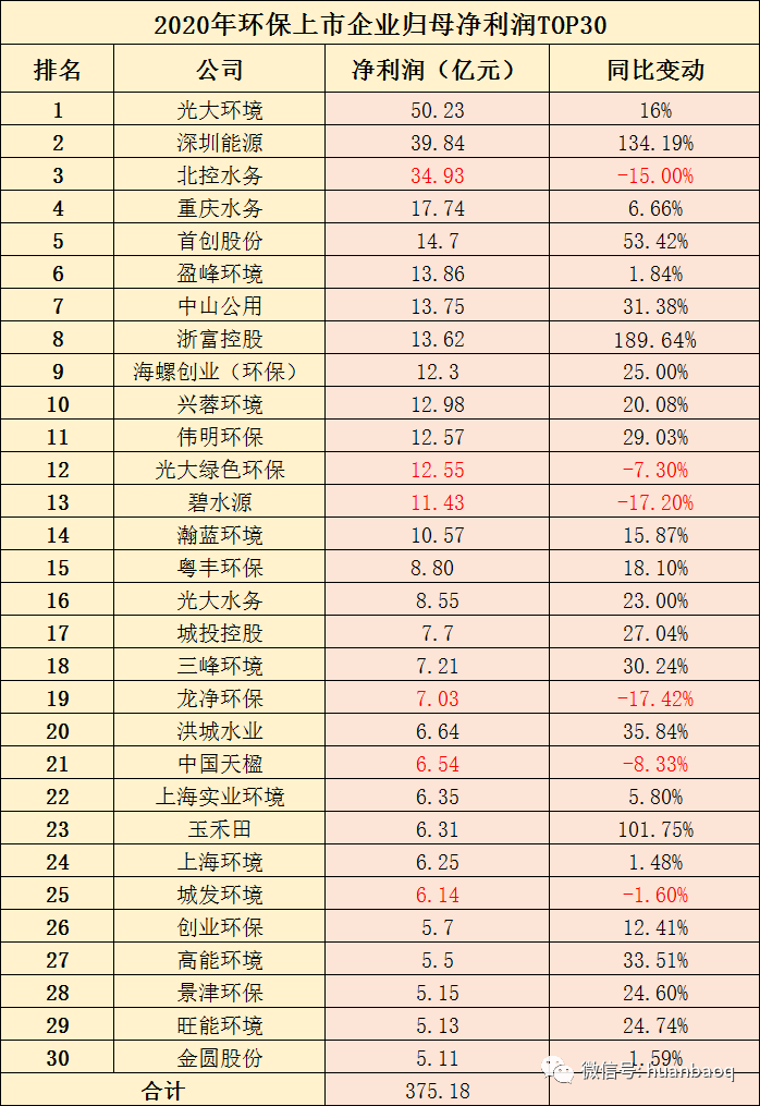 總體來看,111家環(huán)保上市企業(yè)的盈利水平均不高,還有的企業(yè)增收不盈利,比如東方園林,2020年?duì)I業(yè)收入同比增長7.28%至87.26億元,歸母凈利潤卻由盈轉(zhuǎn)虧,虧損4.92億元,原因主要是當(dāng)期計(jì)提了較大金額的減值損失。跟東方園林相似的,還有雪浪環(huán)境、華控賽格、興源環(huán)境、中金環(huán)境,這幾家企業(yè)也是增收不增利,歸母凈利潤較上年度分別虧損了3.36億元、1.66億元、5.29億元、19.6億元。從歸母凈利潤分布區(qū)間來看,111家環(huán)保上市企業(yè),2020年凈利潤能達(dá)到10億元以上的,只有14家,分別是光大國際(50.23億元,16%)、深圳能源(39.84億元、134.19%、北控水務(wù)(34.93億元,-15%)、重慶水務(wù)(17.74億元,6.66%)、首創(chuàng)股份(14.7億元,53.42%)、盈峰環(huán)境(13.86億元、1.84%)、中山公用(13.75億元,31.38%)、浙富控股(13.69億元,191.45%)、海螺創(chuàng)業(yè)(12.3億元,25%)等,這些企業(yè)也是行業(yè)排名非??壳暗腡OP14。如果將TOP14擴(kuò)大到TOP30(如圖七所示),我們會發(fā)現(xiàn),業(yè)內(nèi)排名靠前,掙錢能力突出的30強(qiáng),2020年實(shí)現(xiàn)歸母凈利潤累計(jì)375.25億元,僅國內(nèi)最大環(huán)保龍頭光大環(huán)境一家,2020年凈利潤高達(dá)50.23億元,比北控水務(wù)(34.93億元)首創(chuàng)股份(14.7億元)總和還要高于6千萬。不過,TOP30強(qiáng)中,像業(yè)內(nèi)比較熟悉明星上市環(huán)企,北控水務(wù)、光大綠色環(huán)保、碧水源、龍凈環(huán)保、中國天楹、城發(fā)環(huán)境等,2020年歸母凈利潤都遭到不同程度下滑。中國天楹變化蠻大,2019年因收購江蘇德展并表增厚,無論是營業(yè)收入,還是凈利潤,增長幅度均位居行業(yè)第一,而到了去年,卻出現(xiàn)增收不盈利的尷尬情況。圖七:2020年環(huán)保上市企業(yè)歸母凈利潤TOP30排除頭部30強(qiáng),剩余80家上市環(huán)企中,2020年盈利水平普遍欠佳,50%企業(yè)歸母凈利潤位于億元以下,幾千萬、幾百萬的比比皆是,還有20家處于虧損狀態(tài),距離國家提出壯大節(jié)能環(huán)保裝備、培育環(huán)保集團(tuán)要求甚遠(yuǎn)。凈利潤增幅:聚光科技增幅最大,中金環(huán)境成“虧損王”